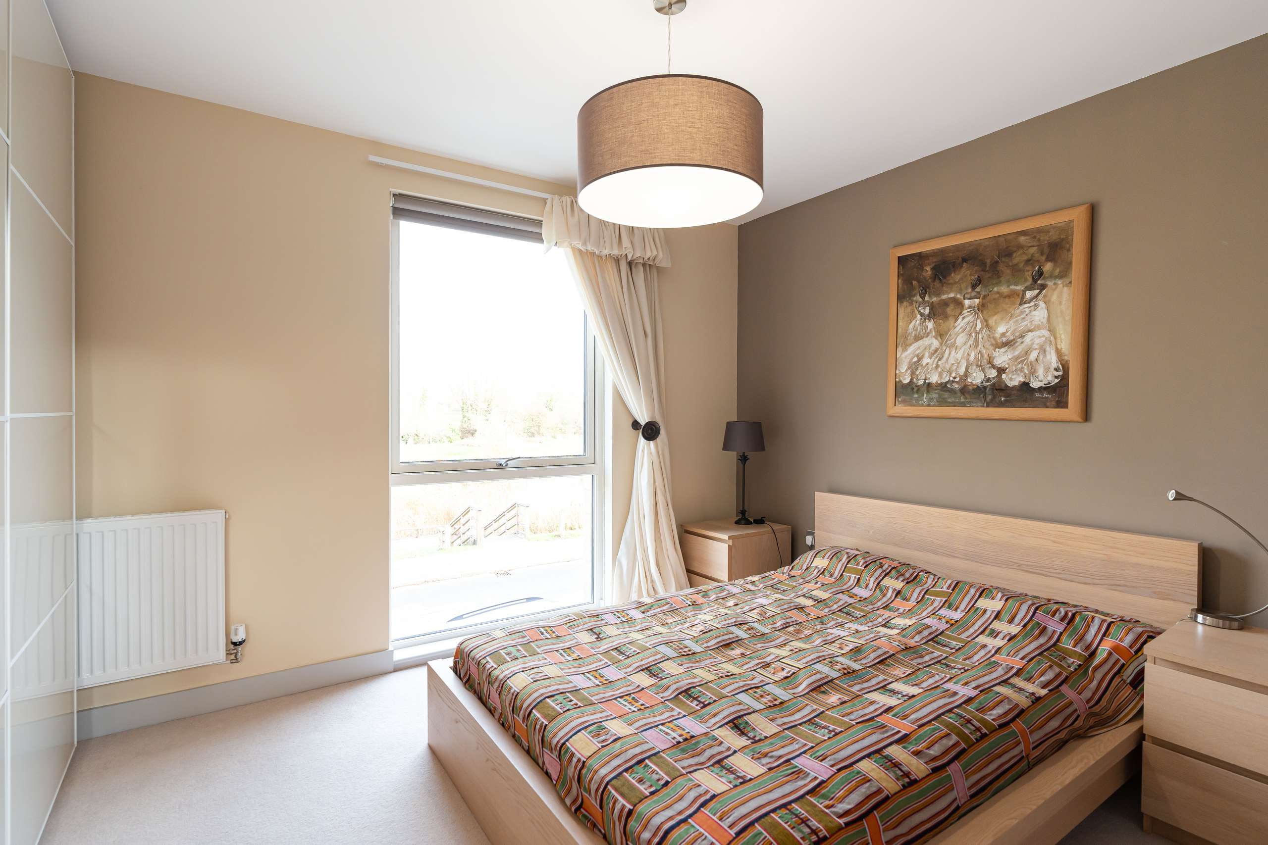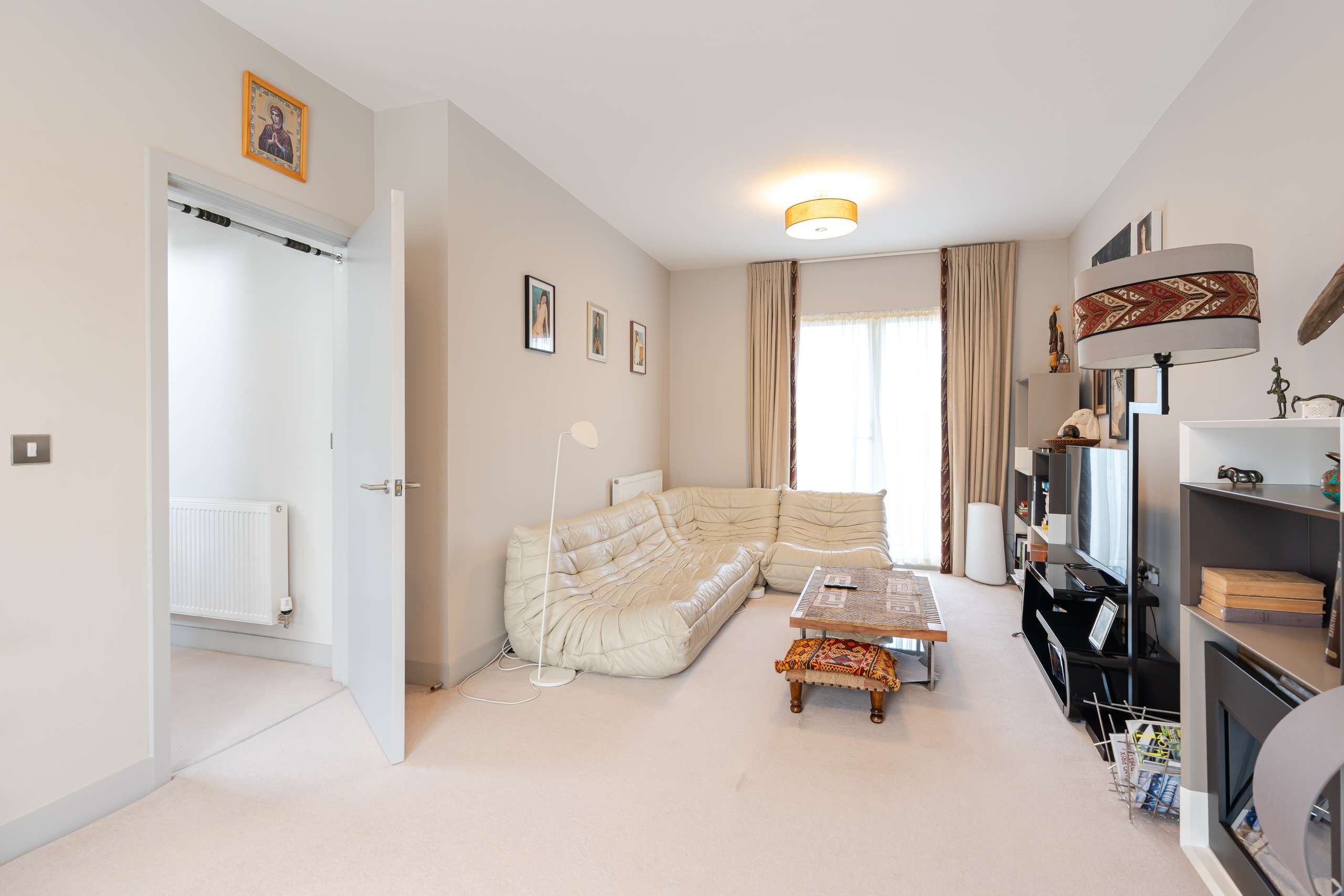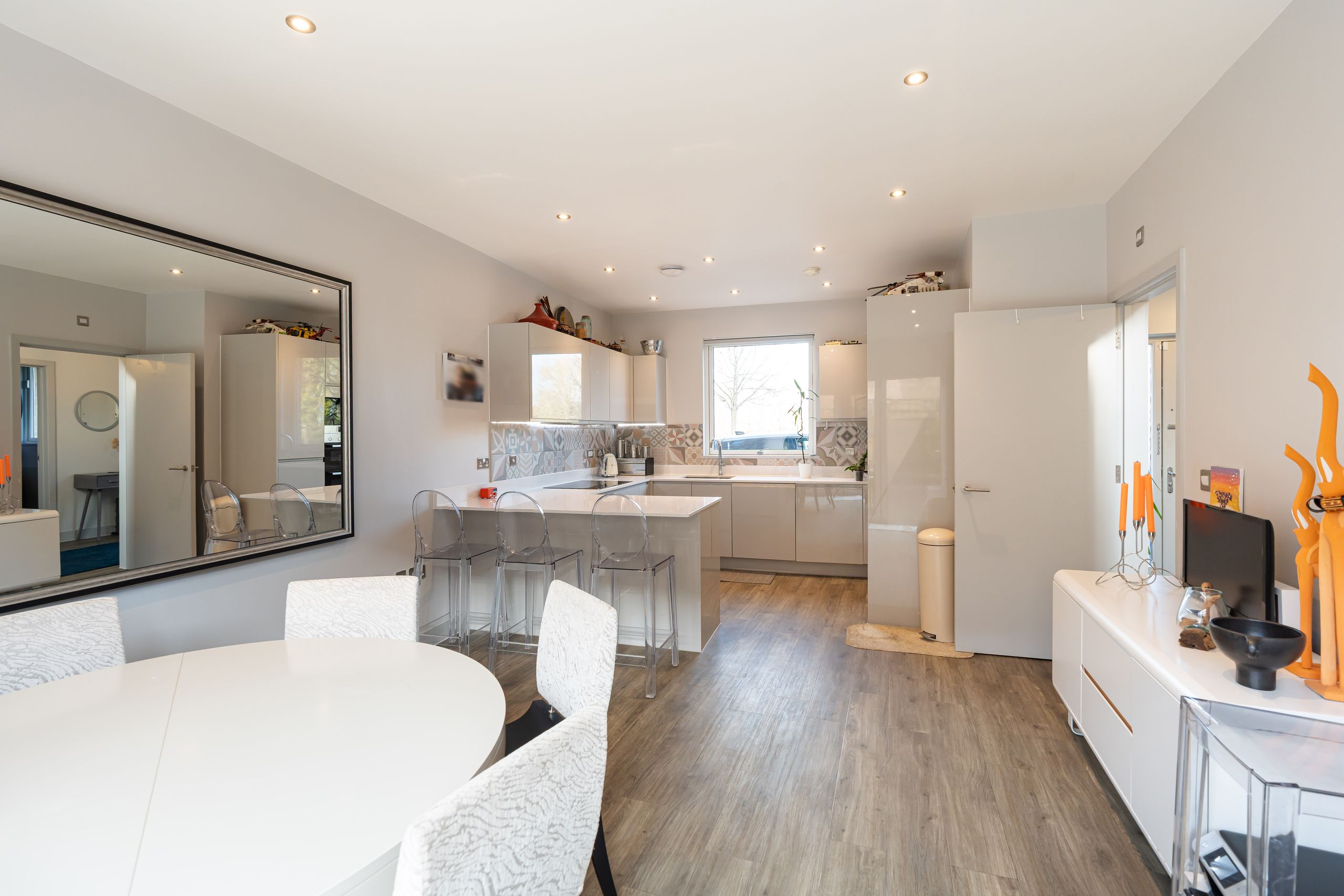 On the first floor, the principal living accommodation continues with a spacious reception room enjoying access to a balcony overlooking the green space and pond. This level also offers two well-sized bedrooms and a contemporary family bathroom, making it ideal for family living or guest accommodation.
