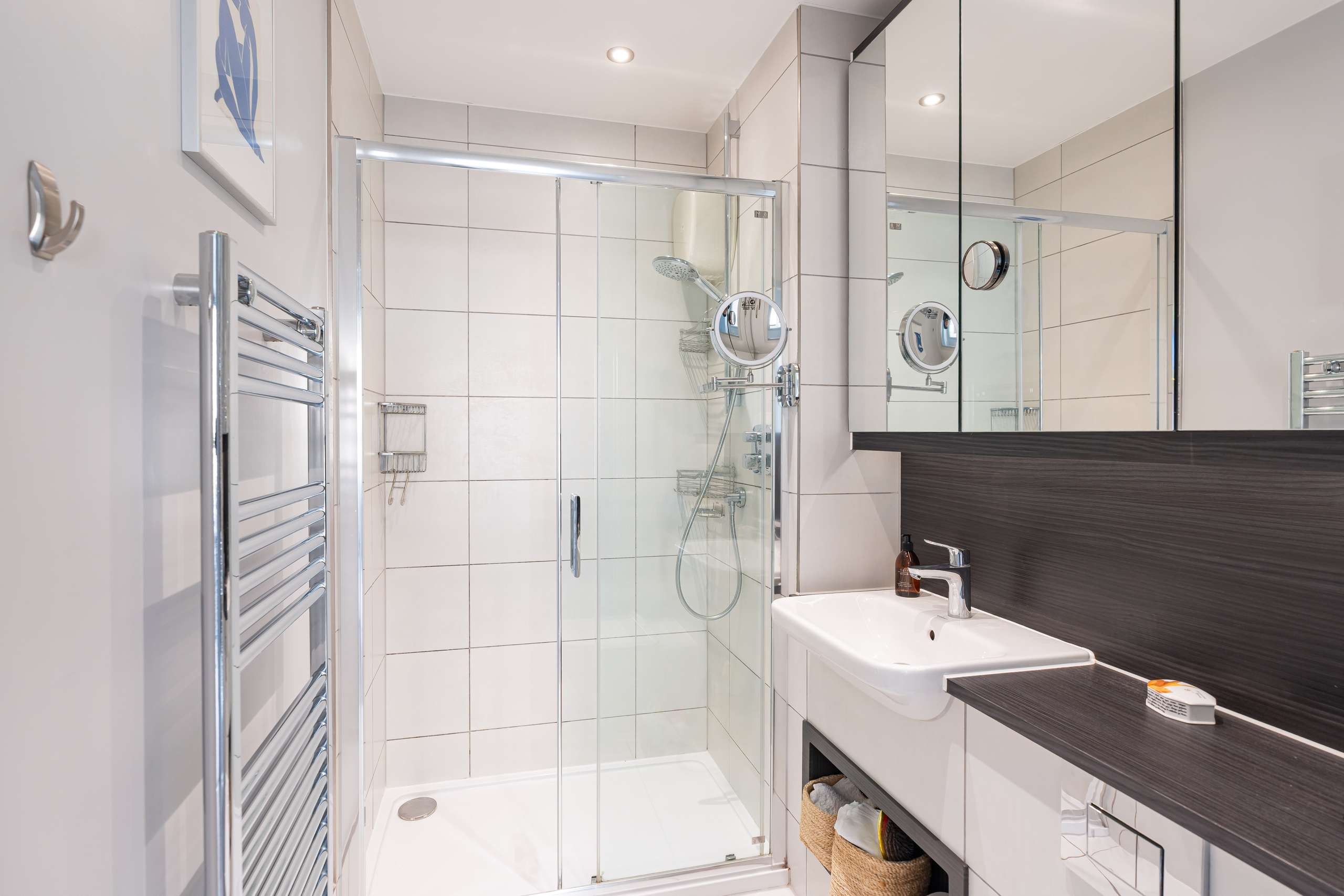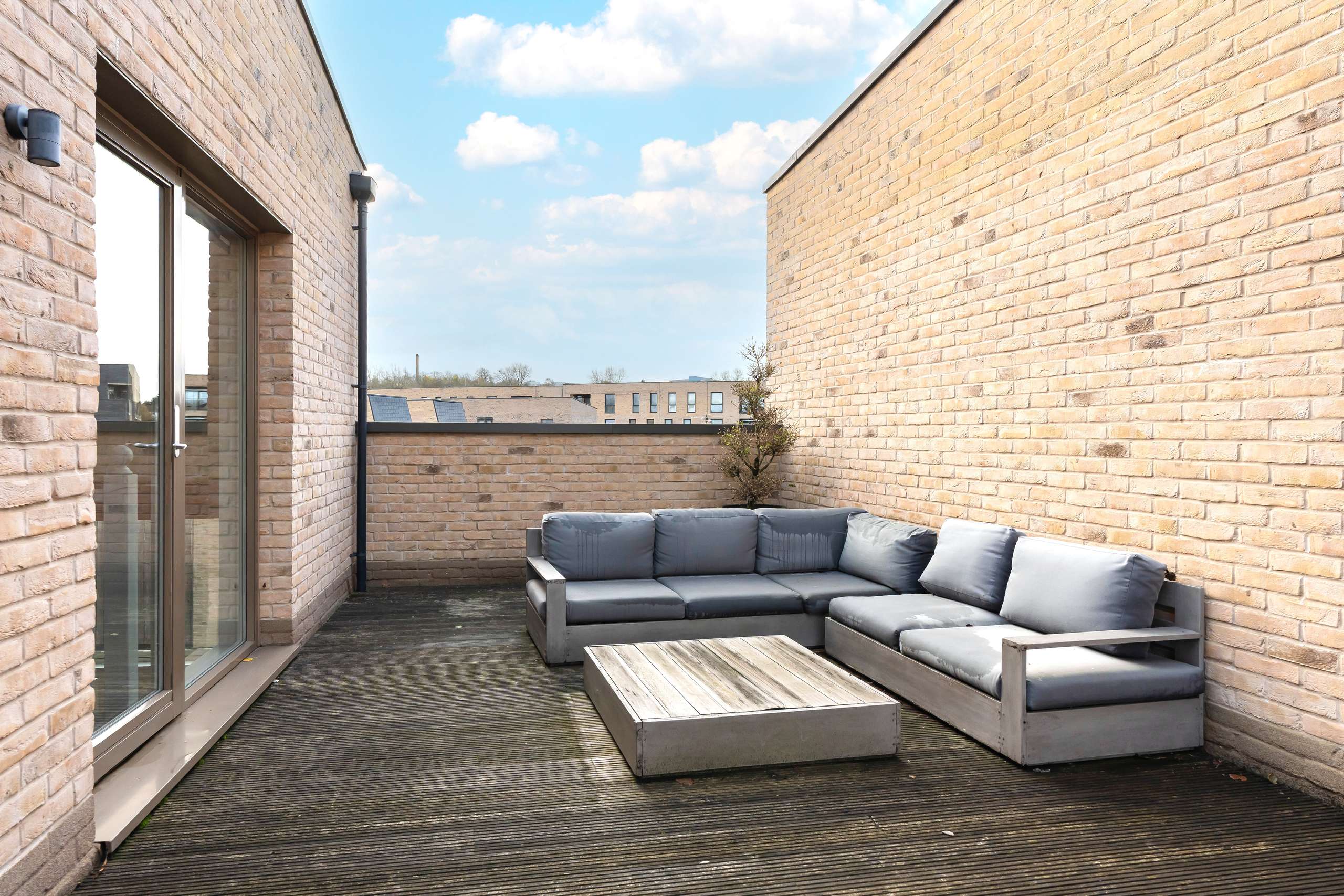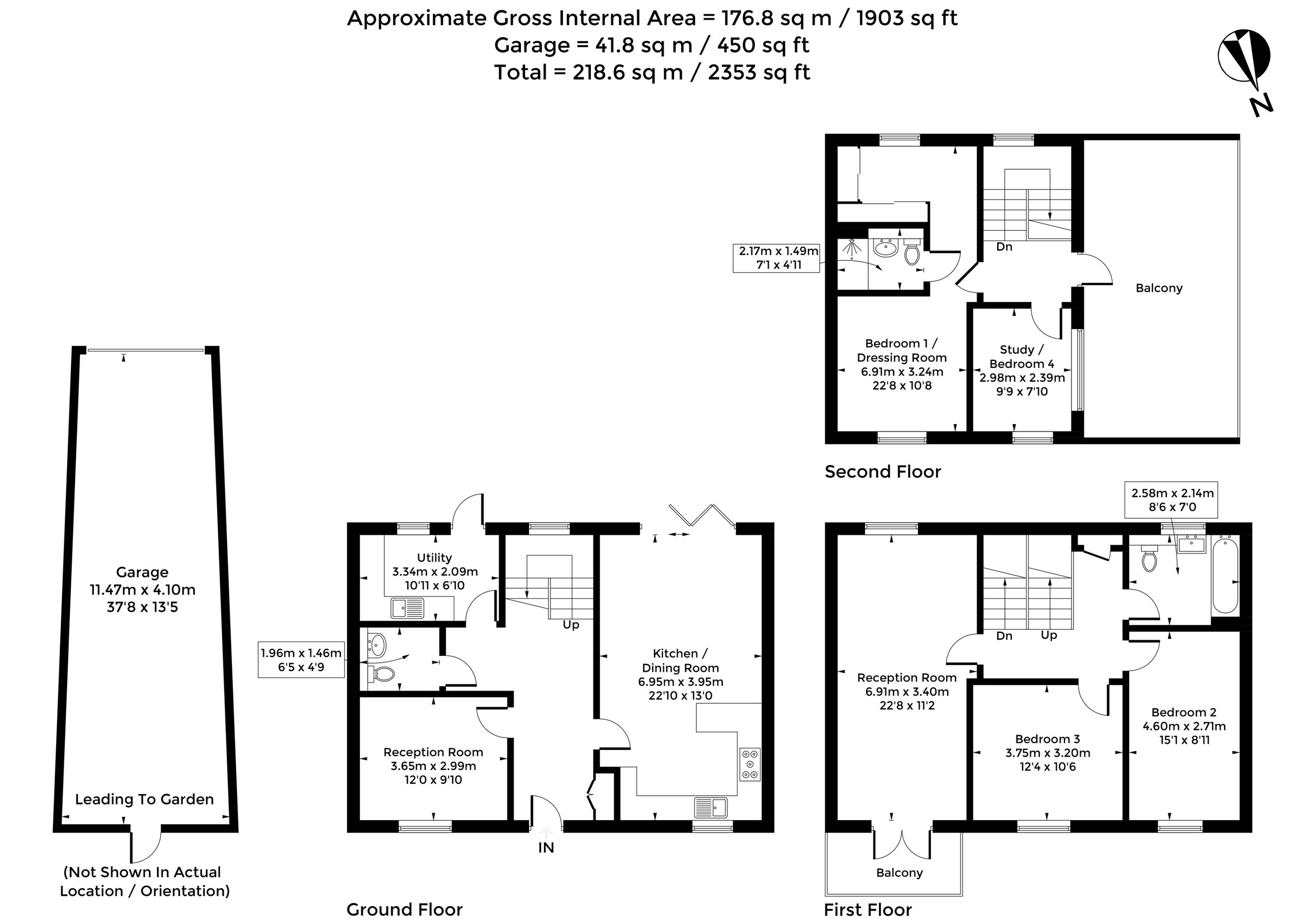 The second floor is dedicated to the main bedroom suite, featuring a large bedroom with an adjoining dressing room and en-suite shower room. A further room on this floor provides flexible space, well suited for use as a study or fourth bedroom, and there is access to an additional large balcony/roof terrace, further enhancing the sense of light and outlook.