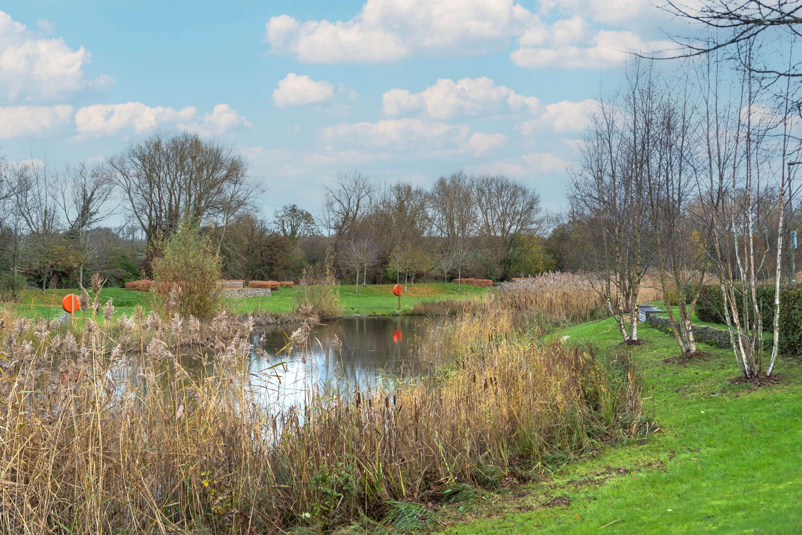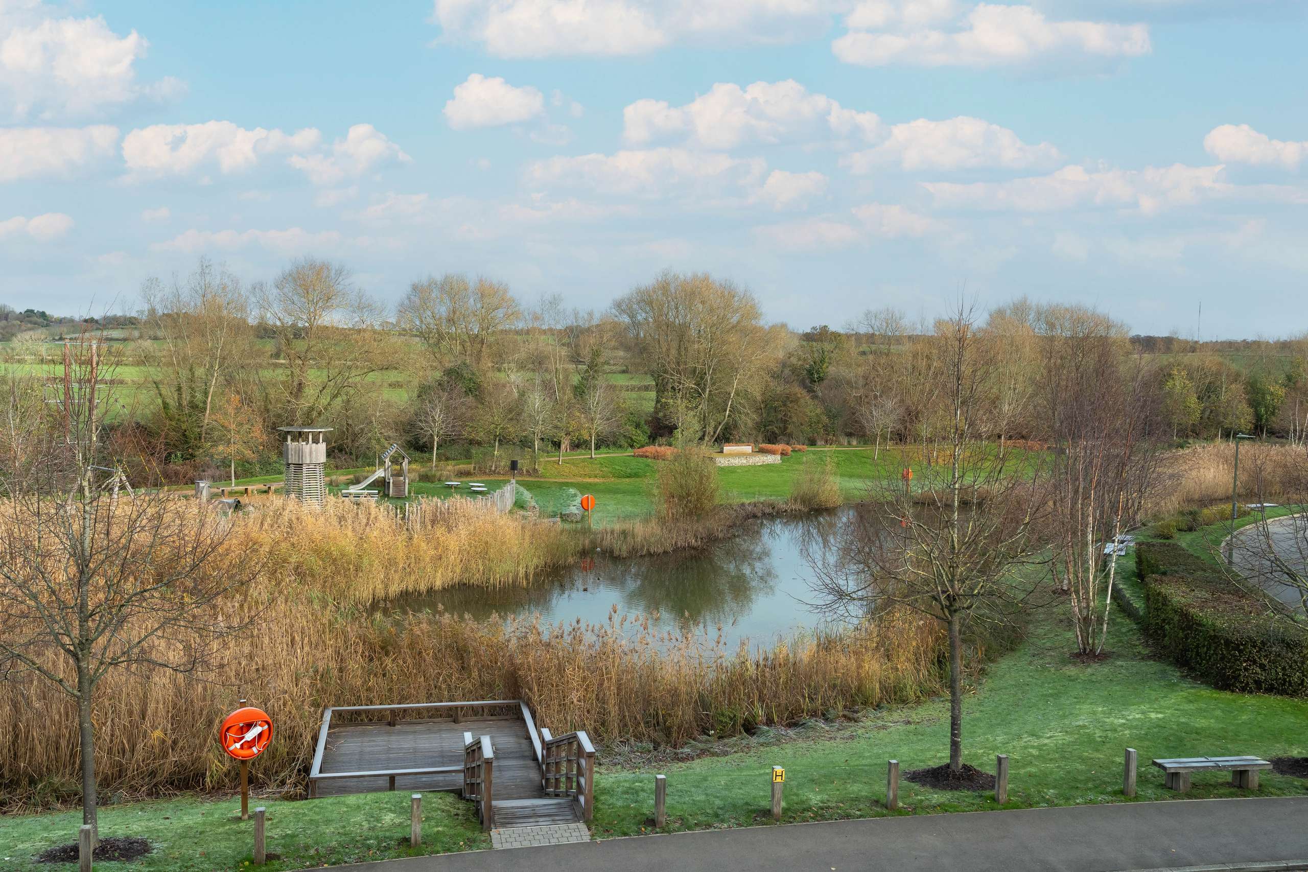 Built in 2019 and finished to a high standard throughout, this modern, well-proportioned home offers flexible accommodation arranged over three floors, with attractive views across the green space and pond.
