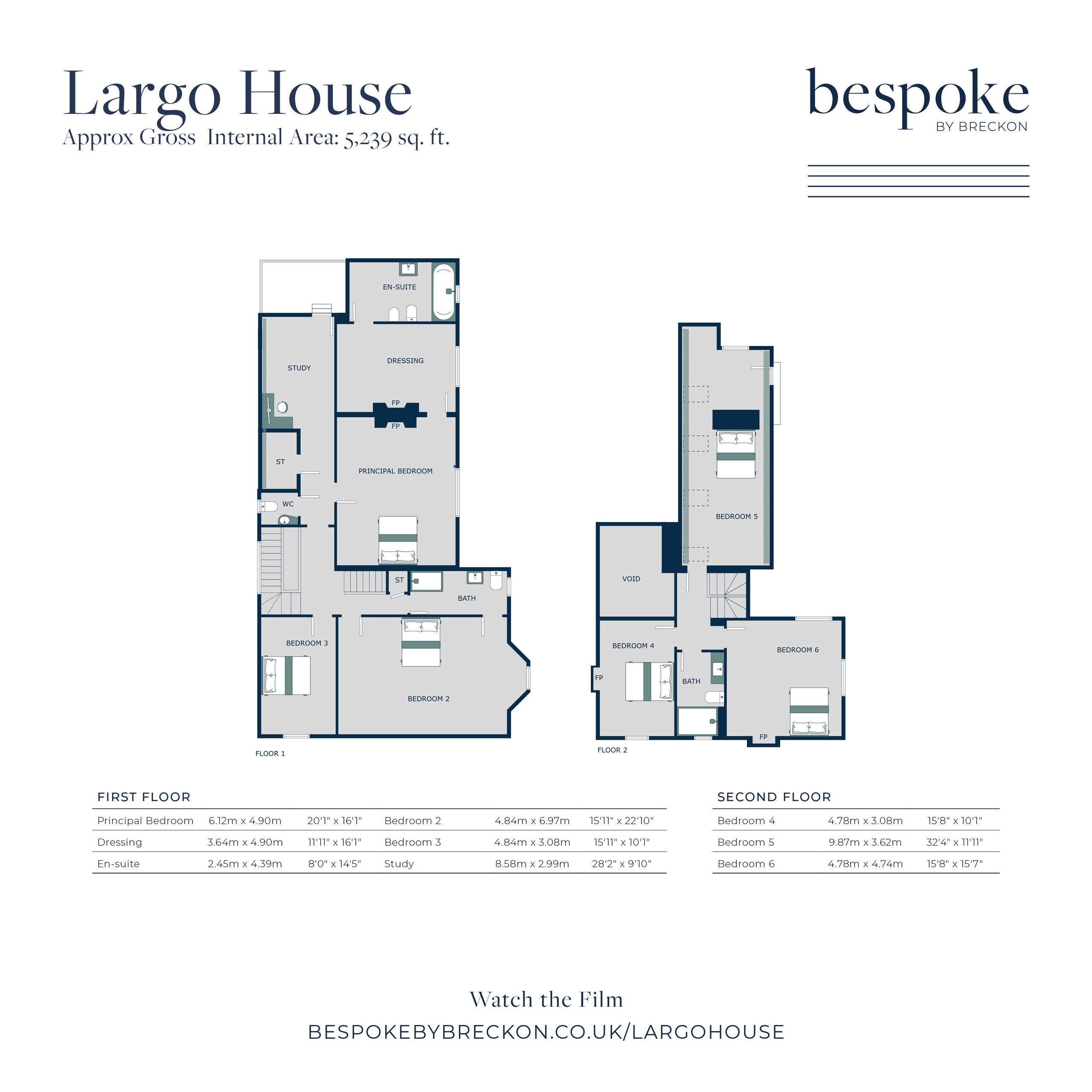Upstairs, the first floor features three bedrooms and a study. The principal bedroom includes a walk-through dressing area and en-suite bathroom, while the study opens onto a castellated balcony with south-facing views across fields and farmland. There is also a useful separate WC. The second floor is home to three additional bedrooms and a family shower room.