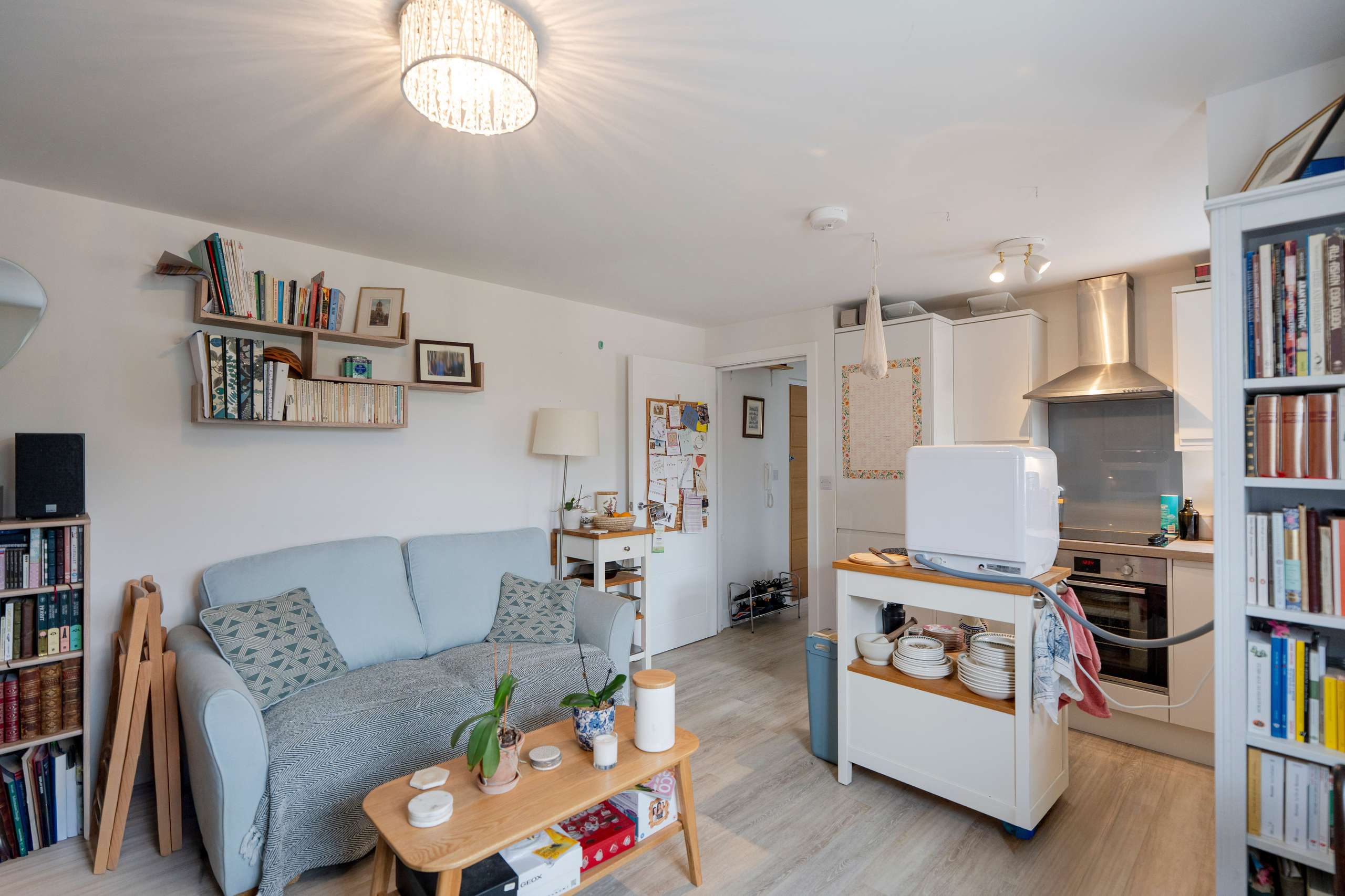 - Open-plan living room/kitchen with built-in appliances