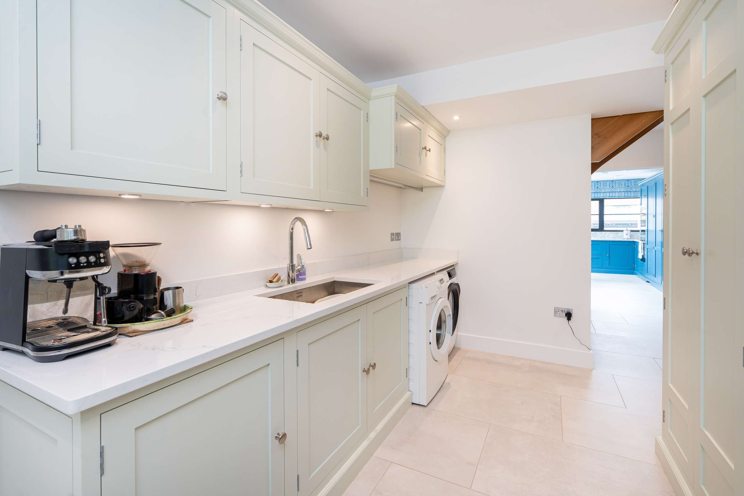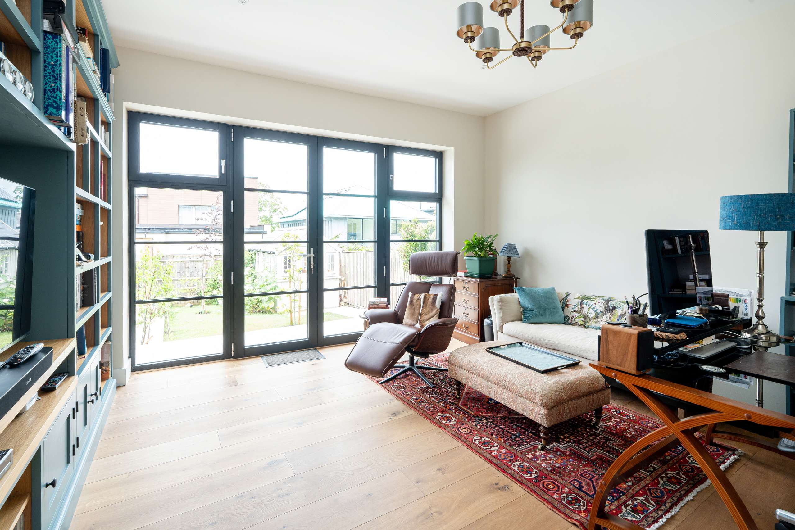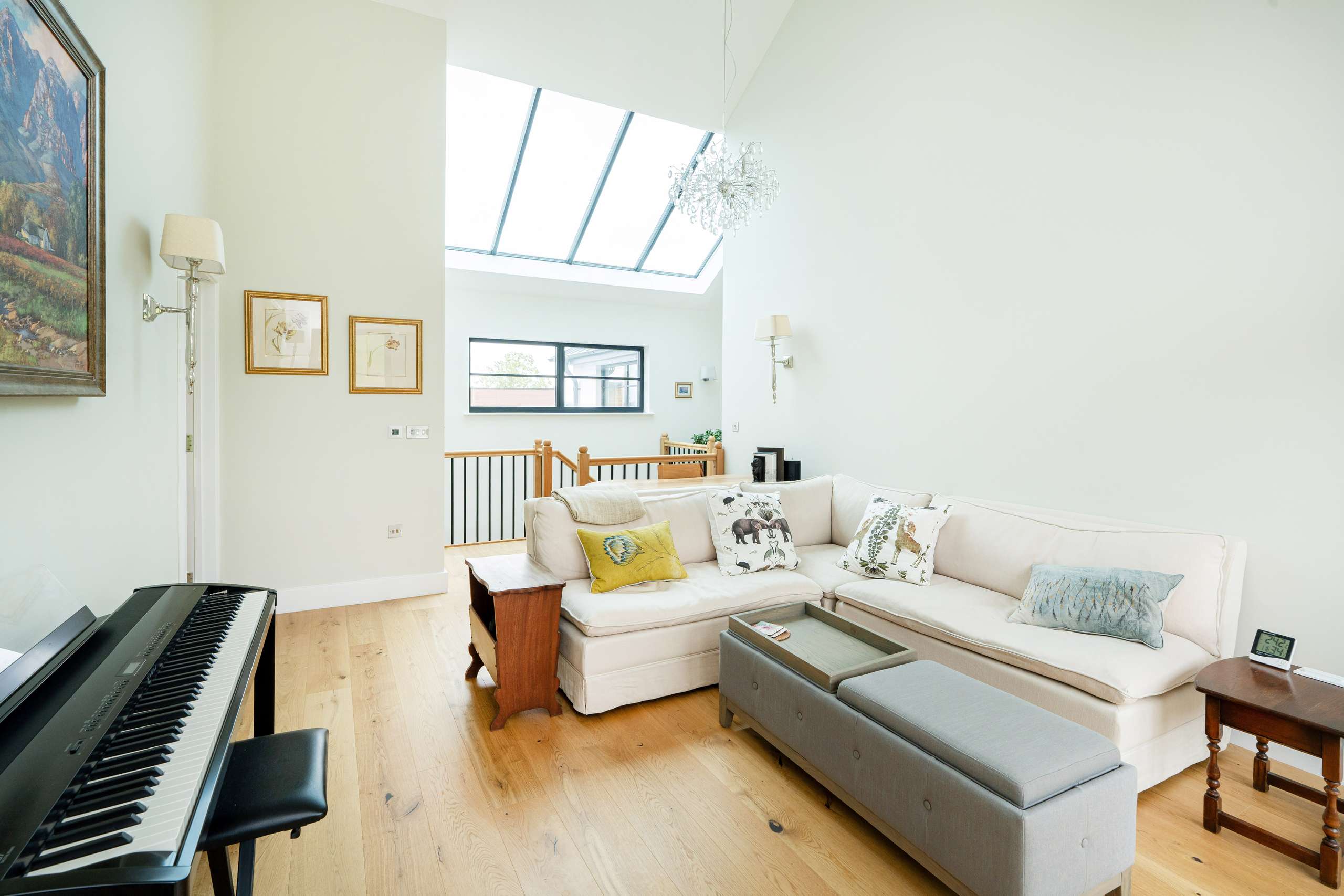 The ground floor offers a truly impressive space, the kitchen/diner is a standout feature with its stunning aluminium glass lantern roof flooding the space with light. Designed with both style and functionality in mind, the beautifully crafted bespoke fitted kitchen featuring a central island comes with top-of-the-line appliances, including Neff venting induction hob, full height fridge and freezer, two-single ovens, ensuring that every culinary need is met. The quartz worktops with add a touch of elegance to the space, while the inclusion of a Quooker instant hot water tap with separate sink provides convenience at your fingertips.