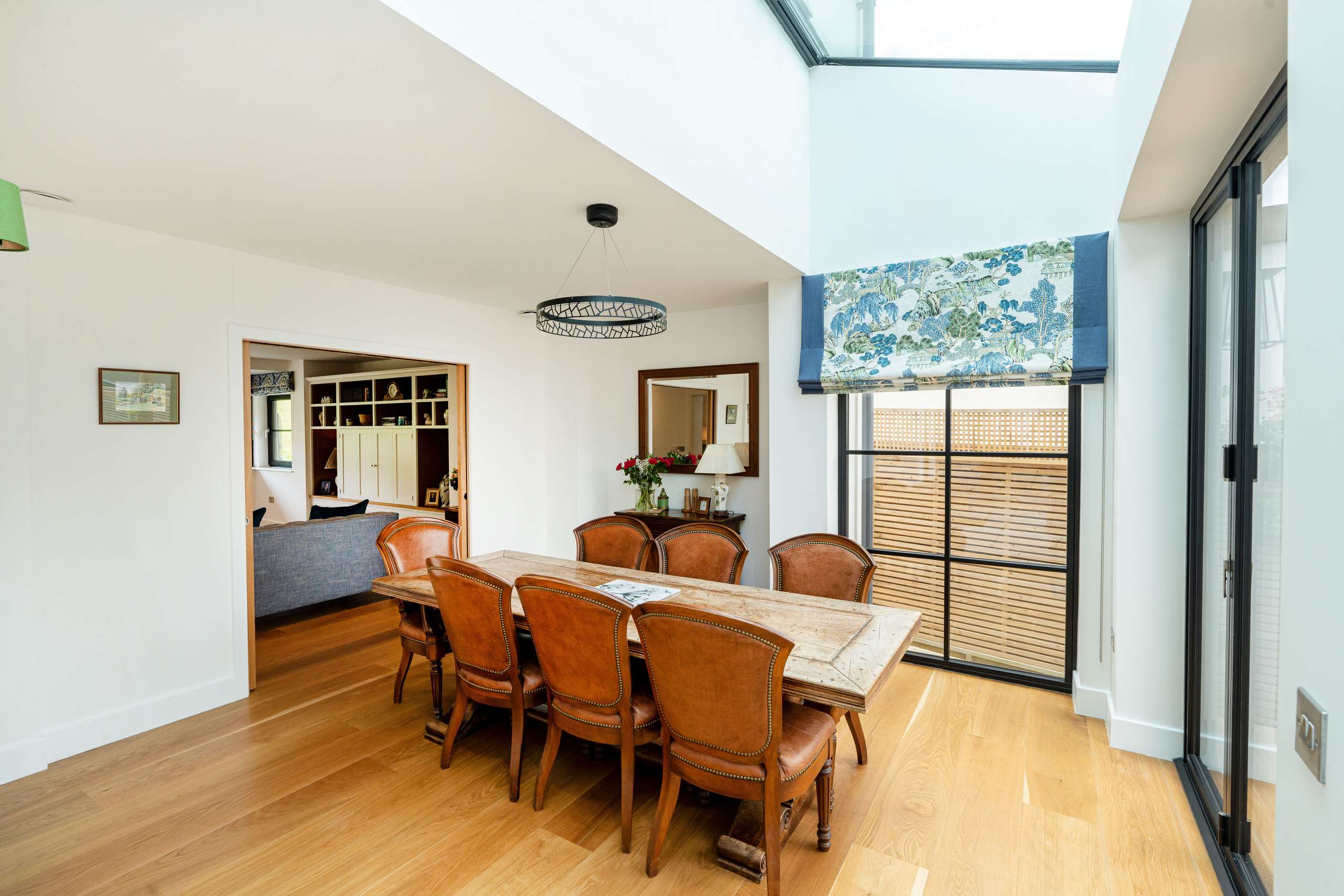 The adjoining dining room, also benefitting from a glass roof is the perfect space for entertaining with friends and family and comes with connecting bi-fold doors to the garden. From here, sliding doors give way to the inviting sitting room, a wonderful retreat to enjoy views of the woodland through cleverly positioned windows and featuring a custom designed wall unit to hide and accommodate a large screen television.