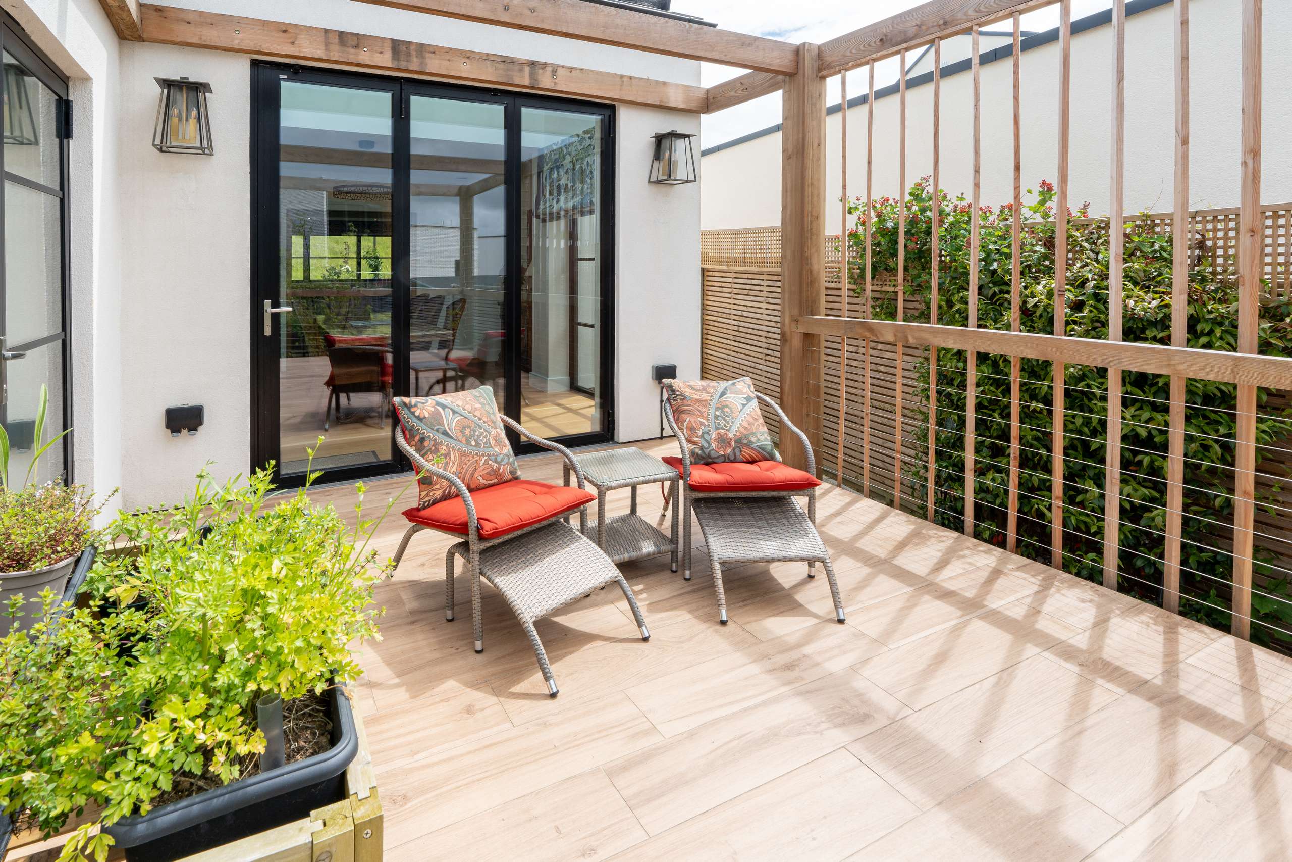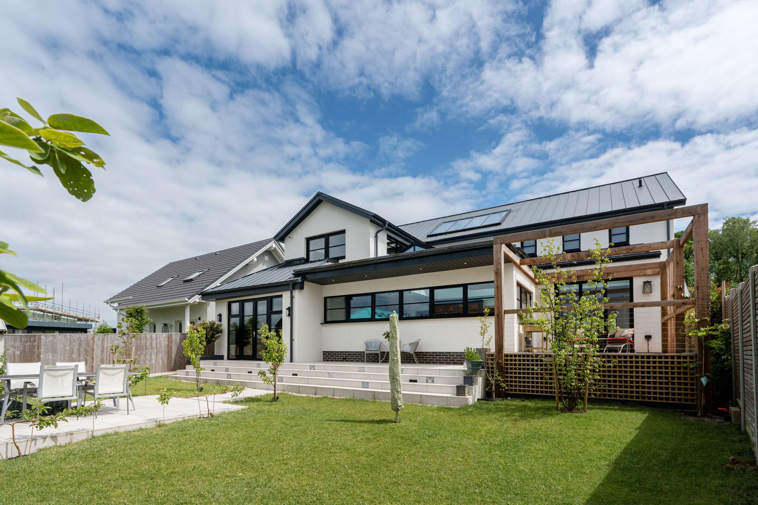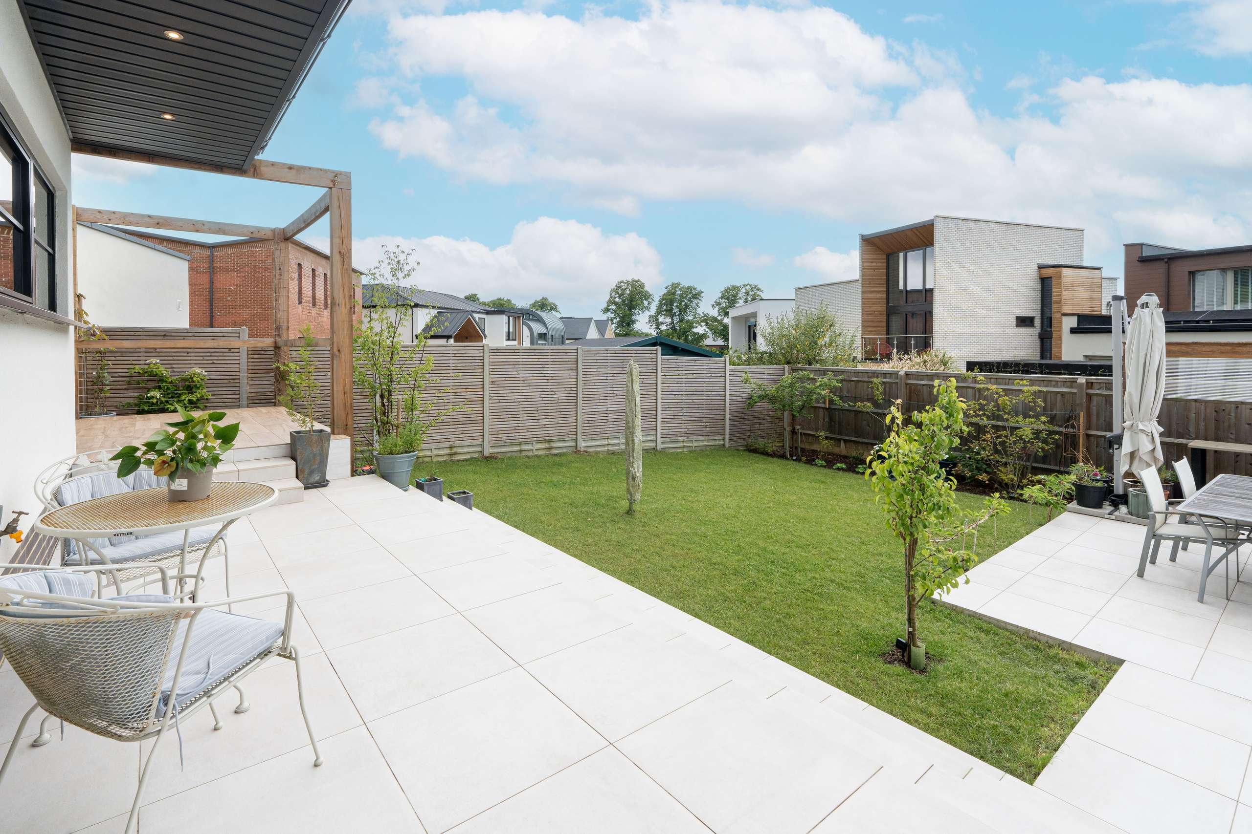 Step outside into a beautifully landscaped rear garden with raised porcelain patio, with steps leading to the lawn and additional patio area complete with pergola, perfect for alfresco dining, attractive trees, and a secluded decked area ideal for sun loungers on a hot summer’s day.