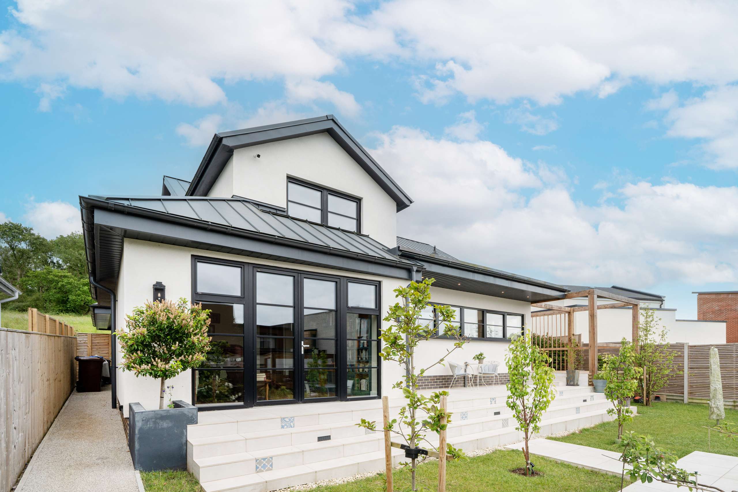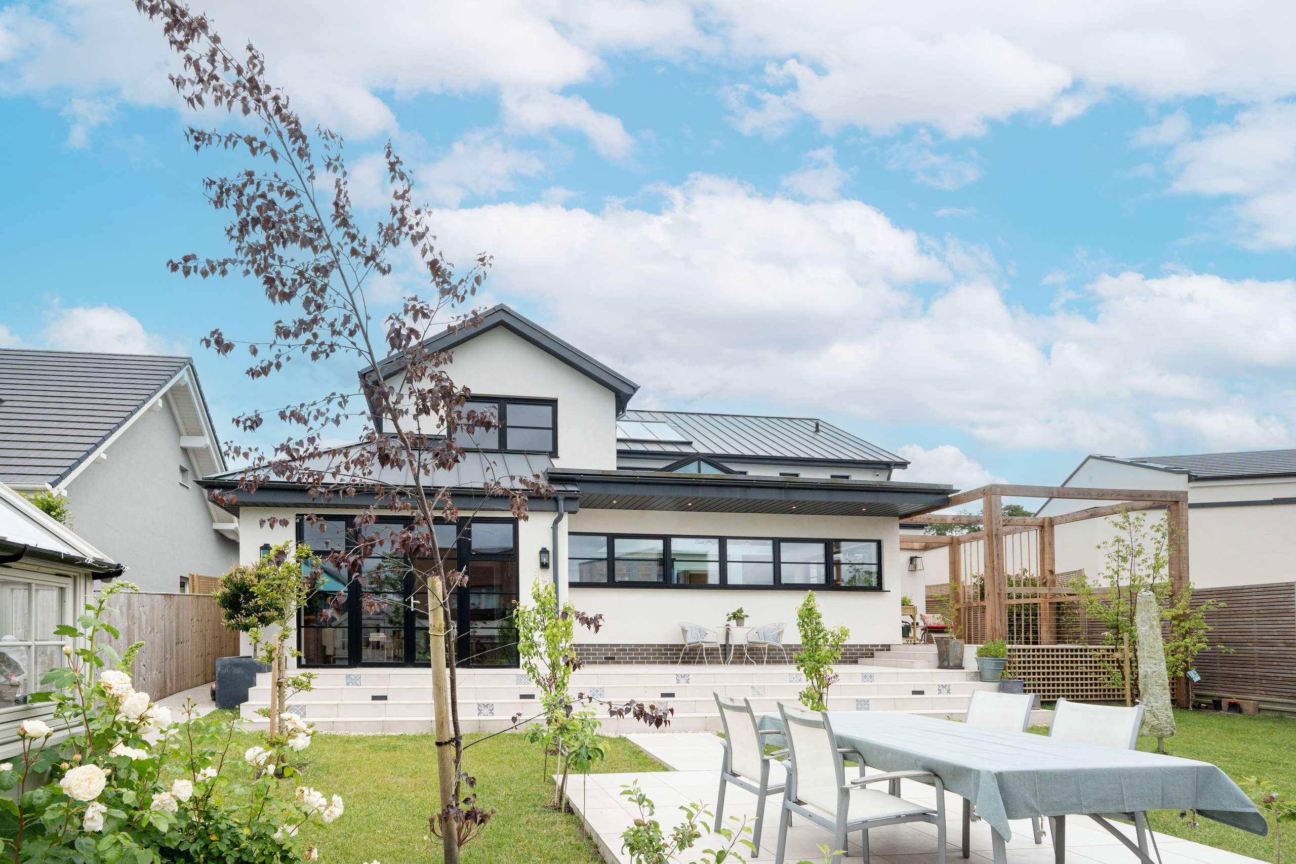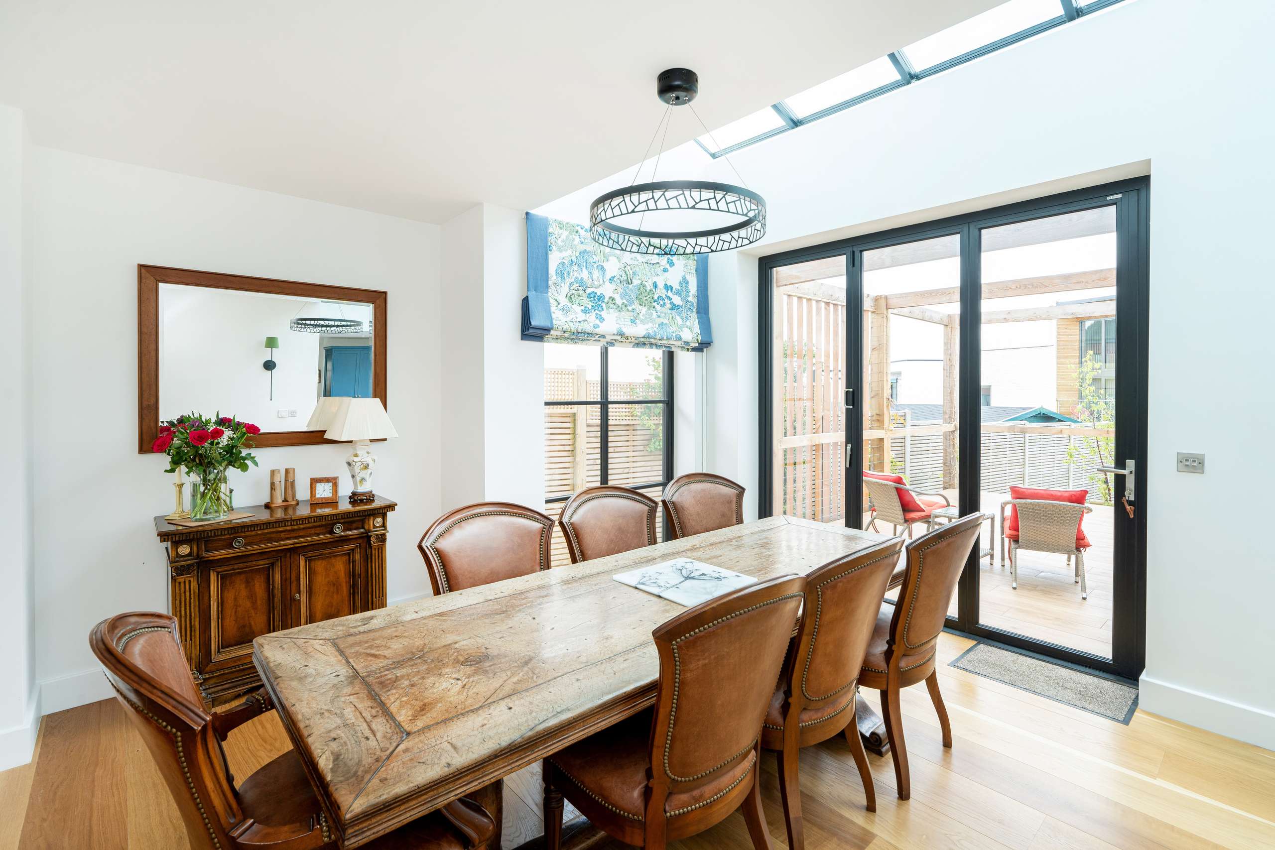 Step outside into a beautifully landscaped rear garden with raised porcelain patio, with steps leading to the lawn and additional patio area complete with pergola, perfect for alfresco dining, attractive trees, and a secluded decked area ideal for sun loungers on a hot summer’s day.