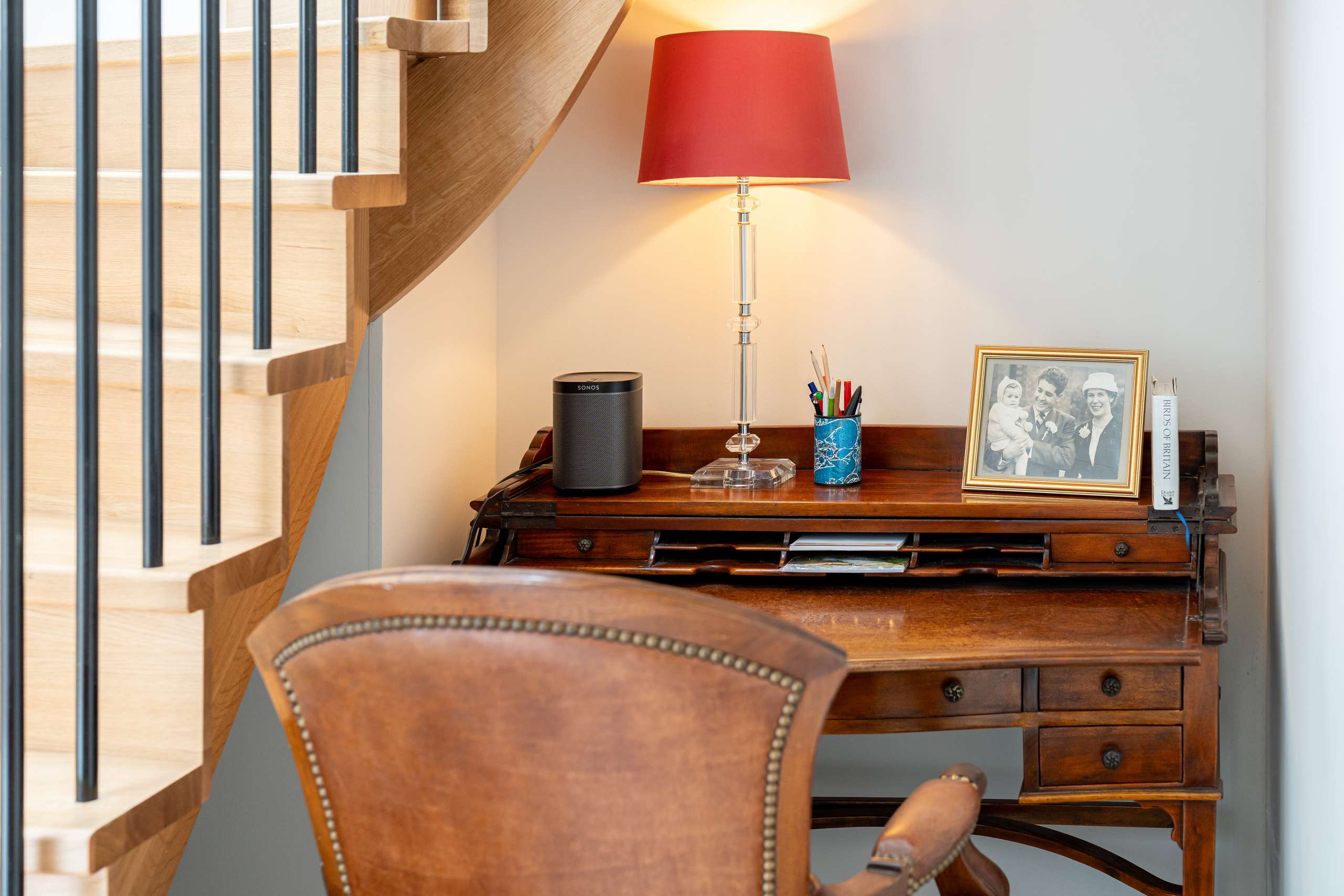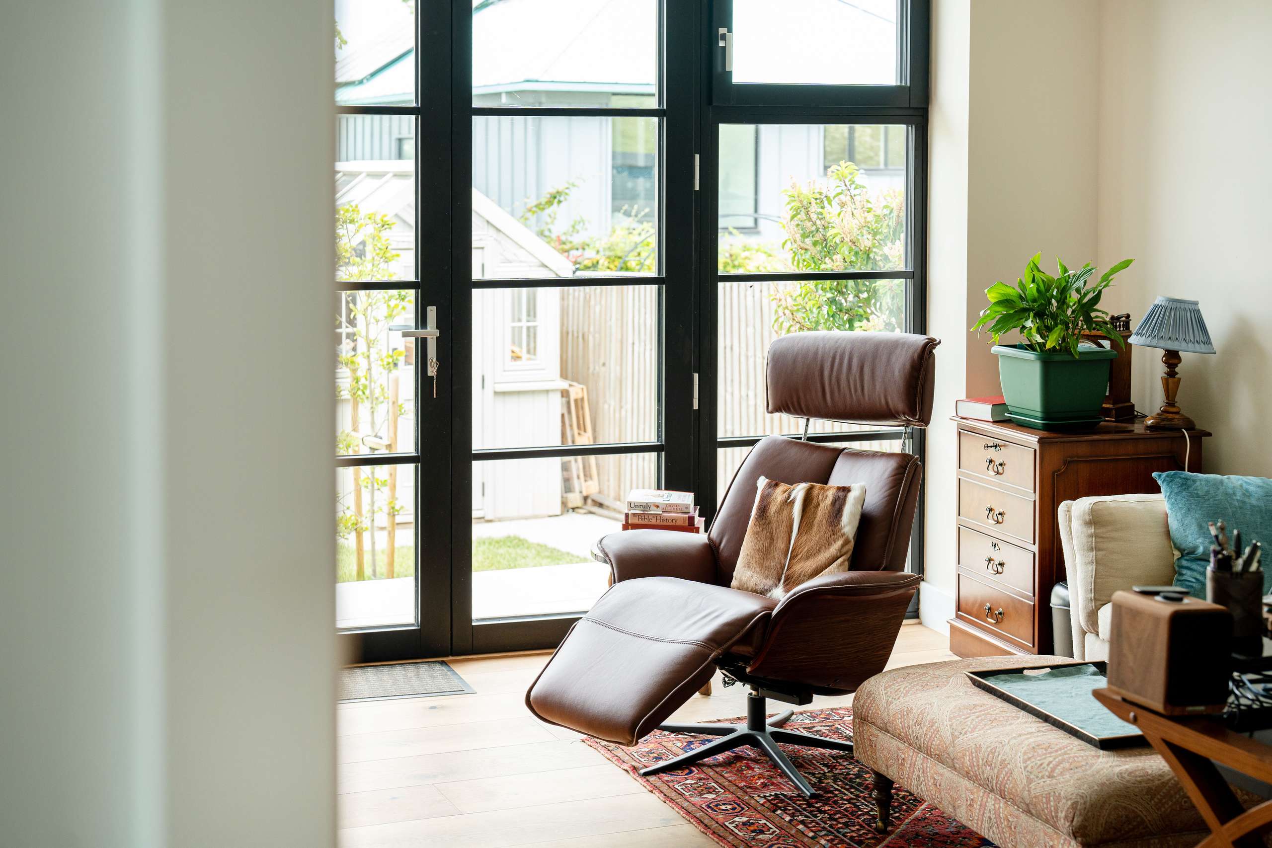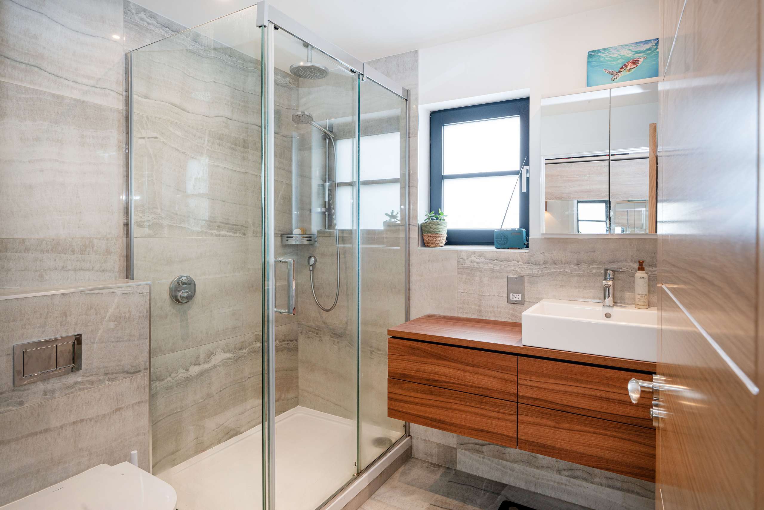 To the rear is a generous sized office/bedroom overlooking the garden, with bespoke full height cabinetry and expansive double doors opening to the raised patio area. Adjacent is vibrantly decorated shower room.