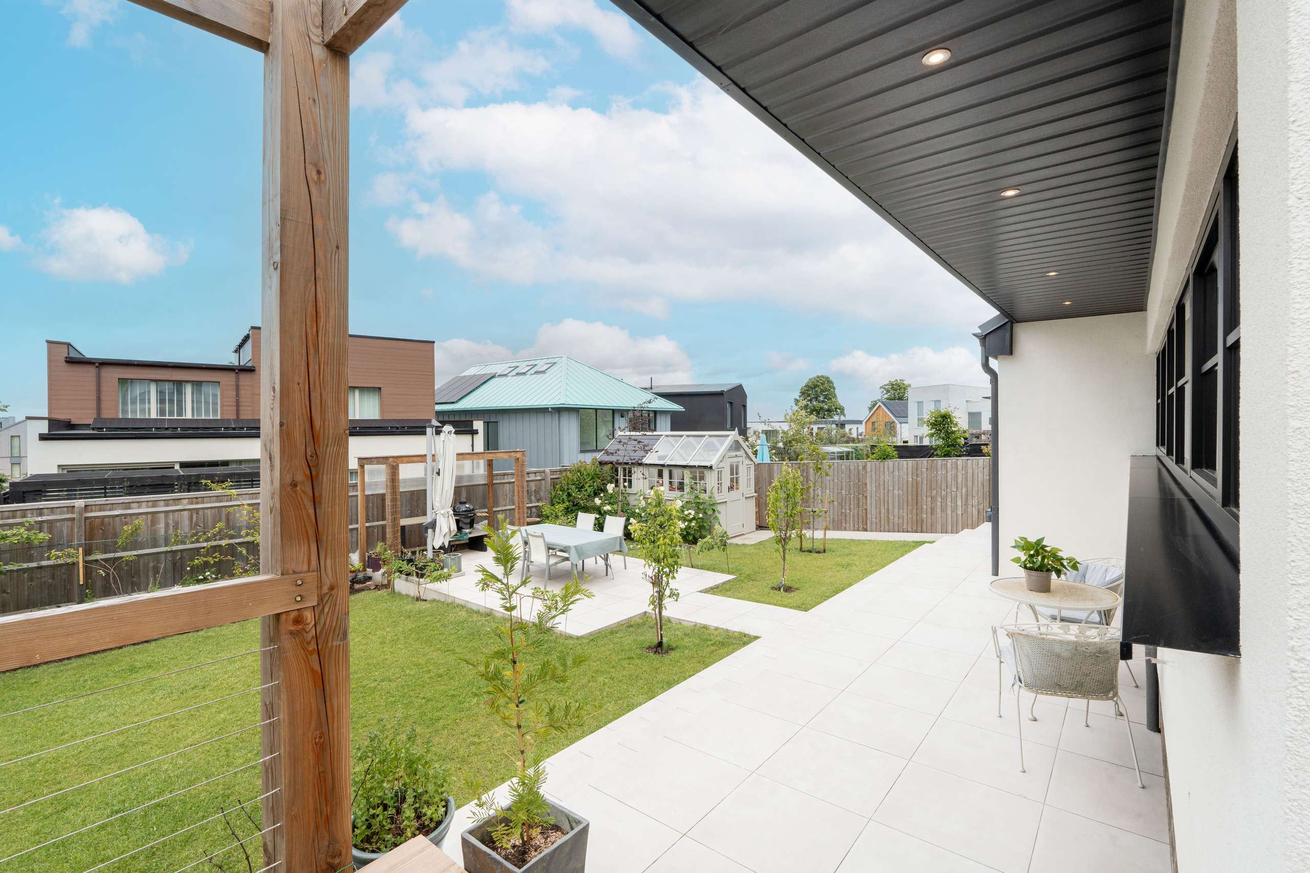 The very generous single garage has an EV car charger installed, integrated with the solar and battery system to provide charge needed for the lowest cost and an insulated electric Hormann door. A covered parking space can be found alongside the garage.
