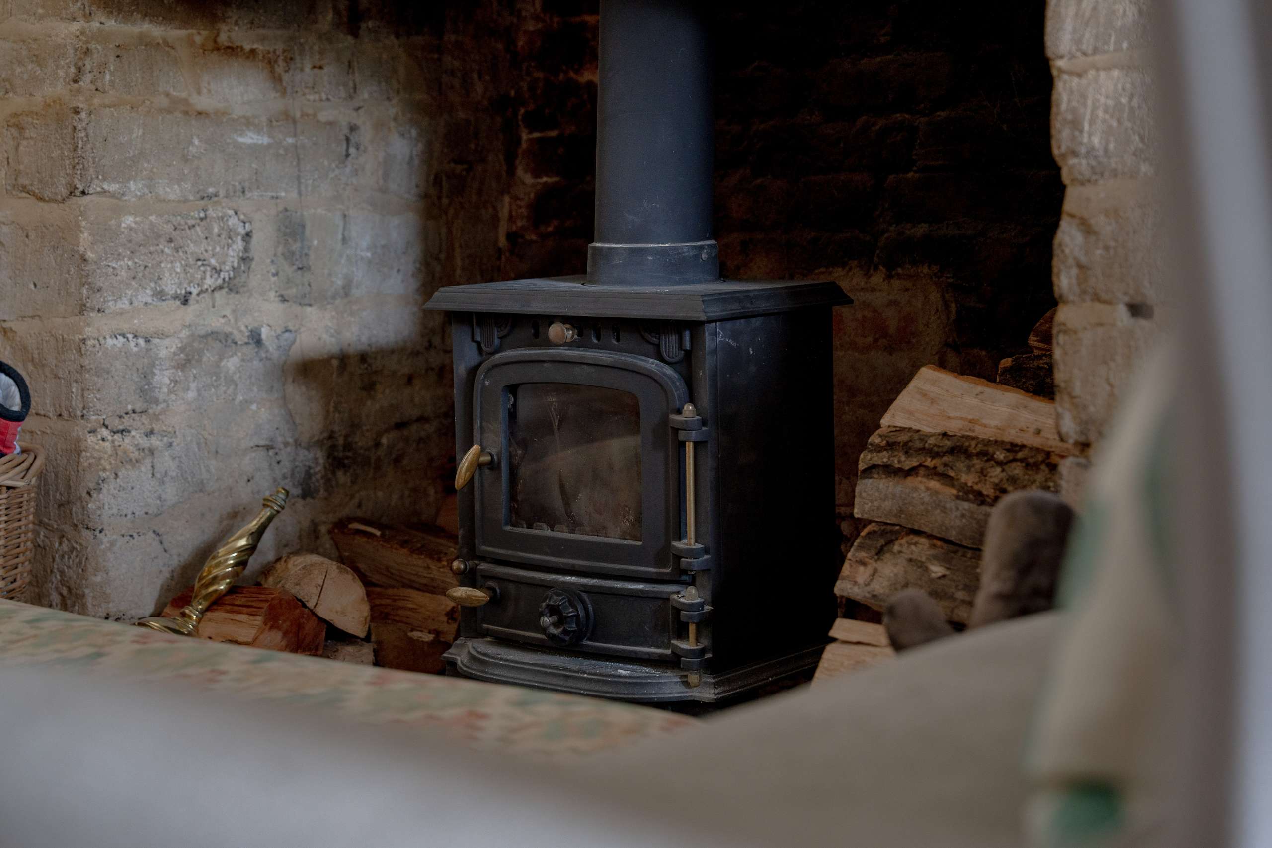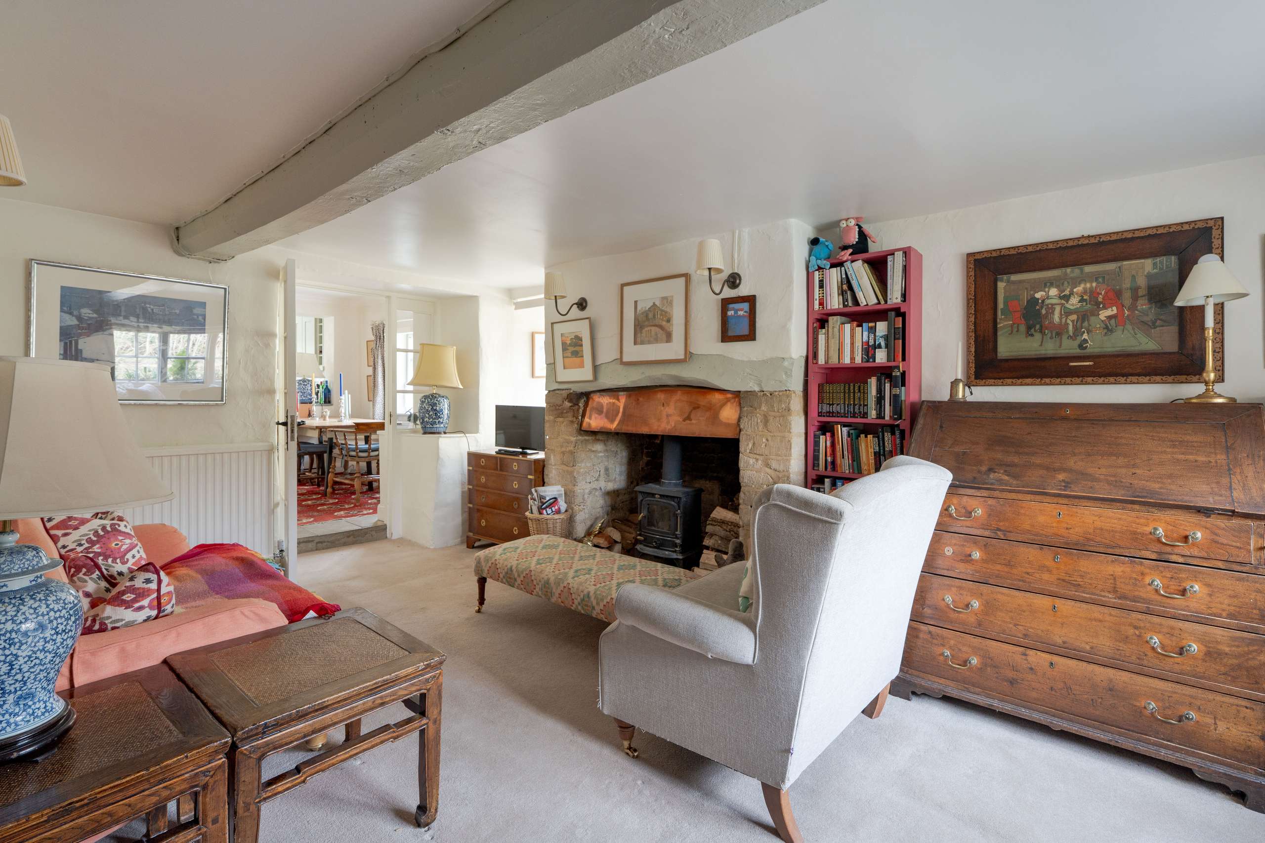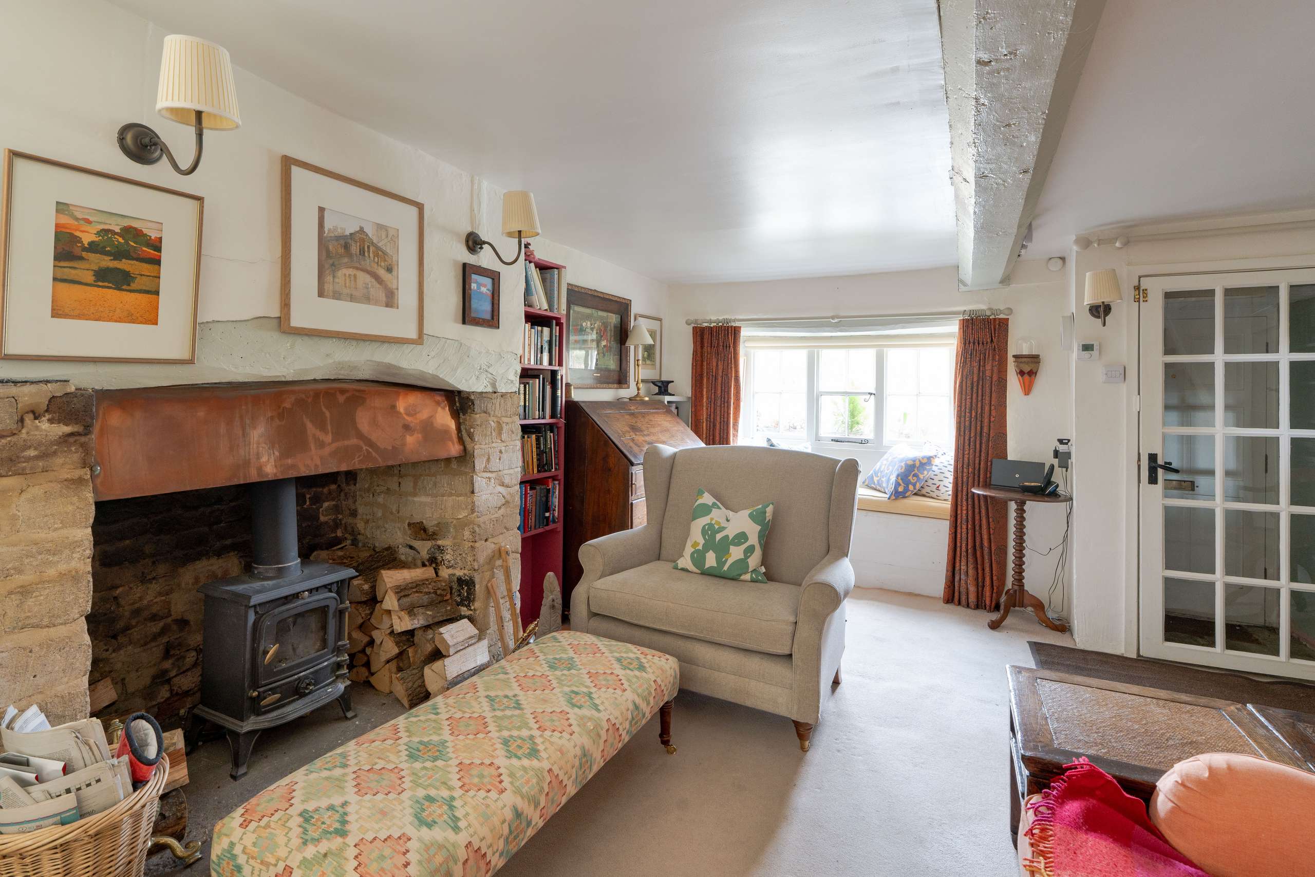 - Characterful principal reception room with a substantial stone fireplace, wood-burning stove, and deep-set window seat.