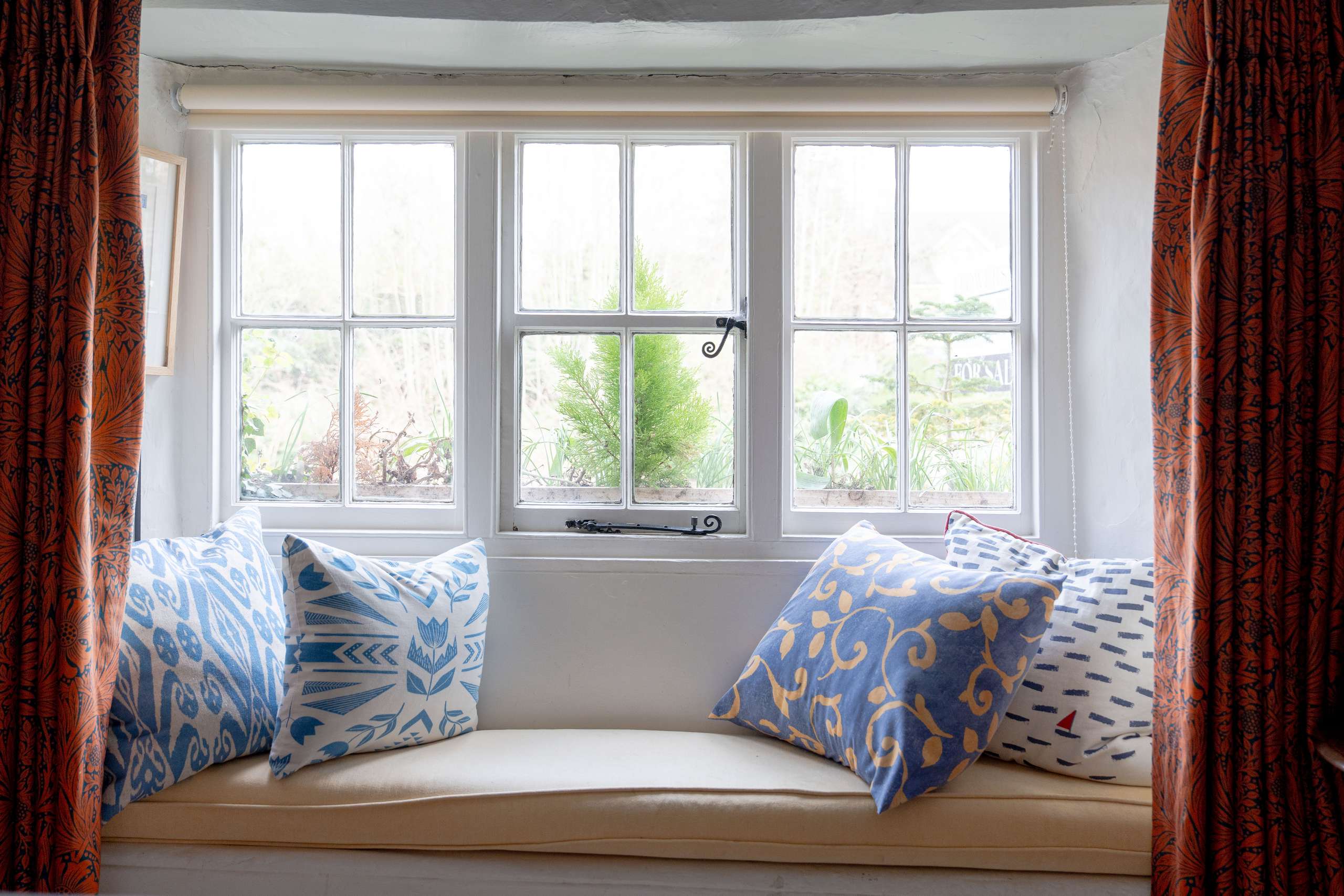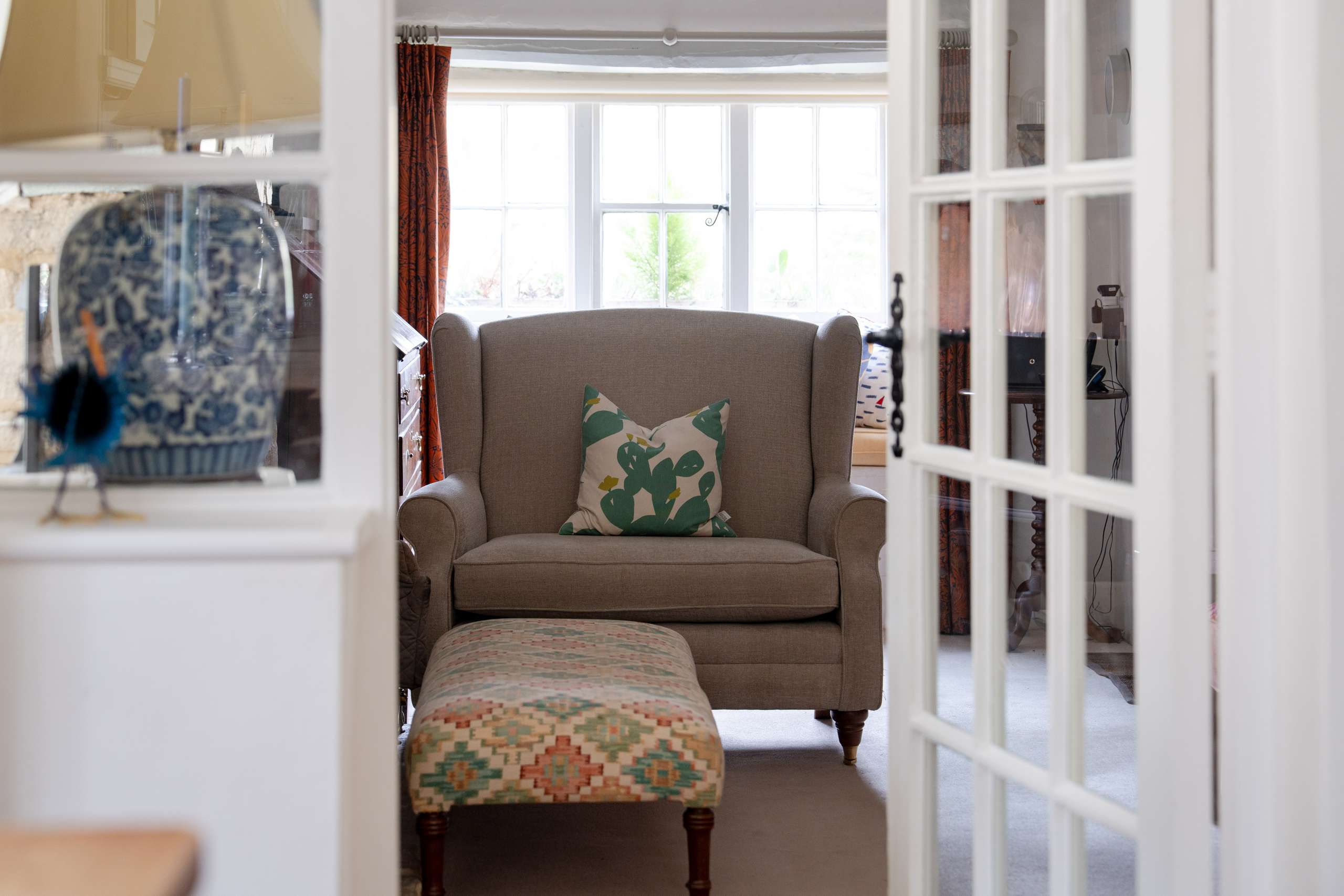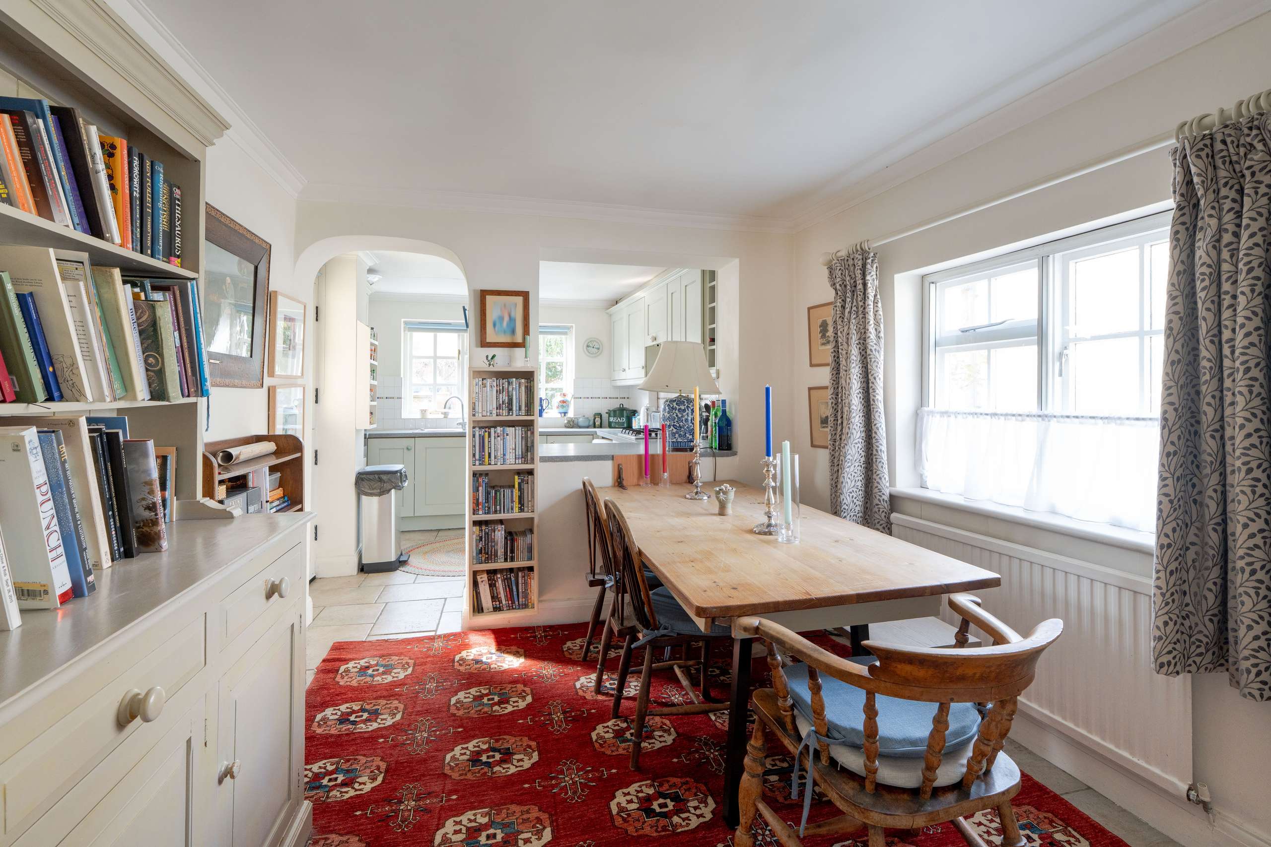 - Characterful principal reception room with a substantial stone fireplace, wood-burning stove, and deep-set window seat.