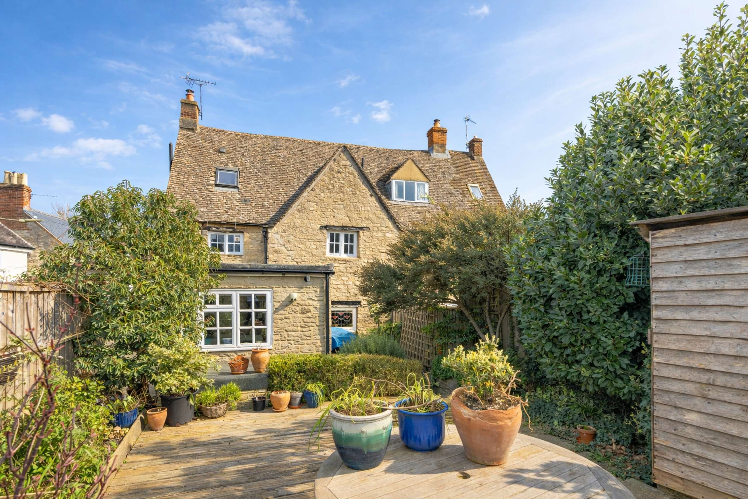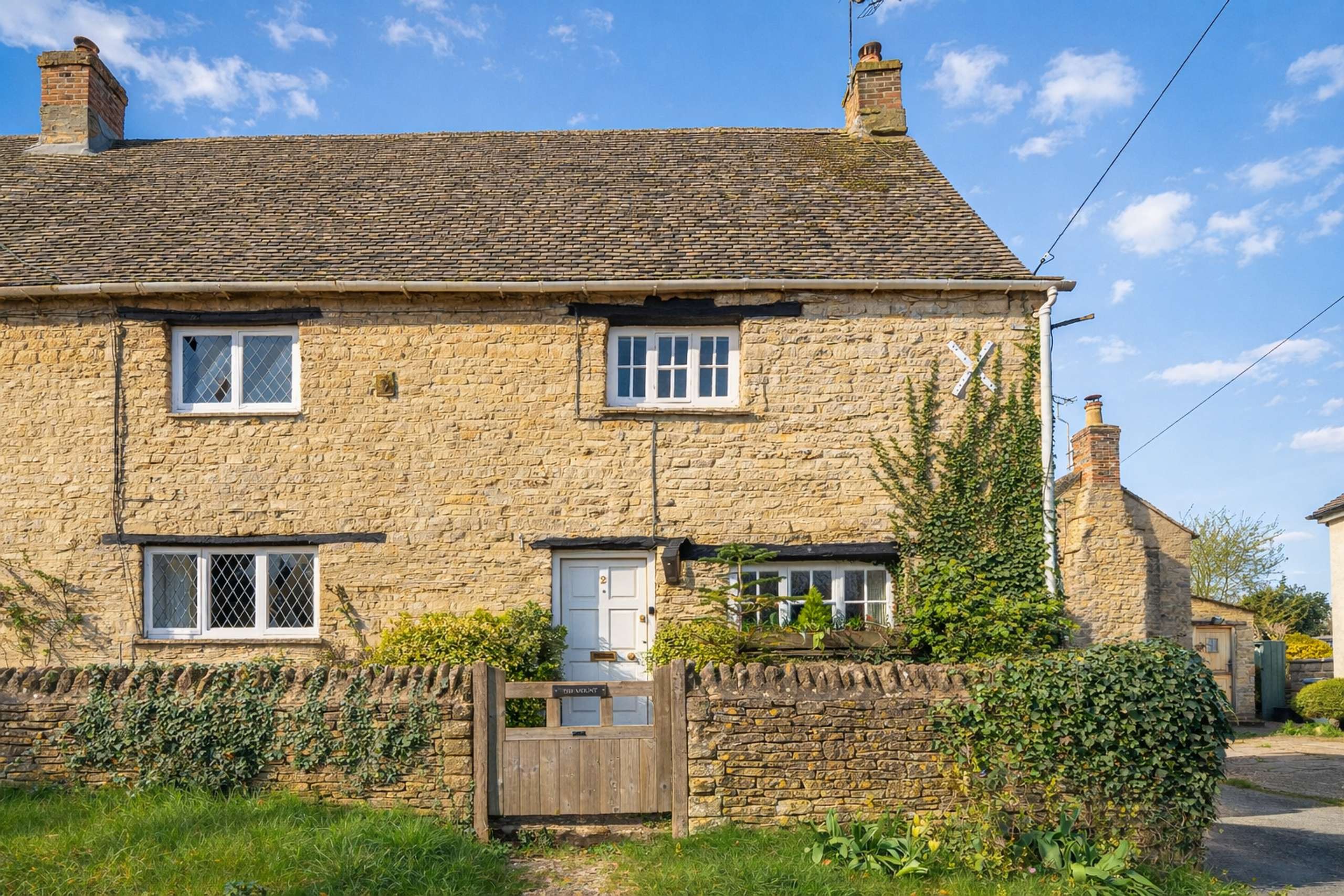 - Elevated position on a quiet lane, with a honey-hued Cotswold stone façade and timber detailing.
