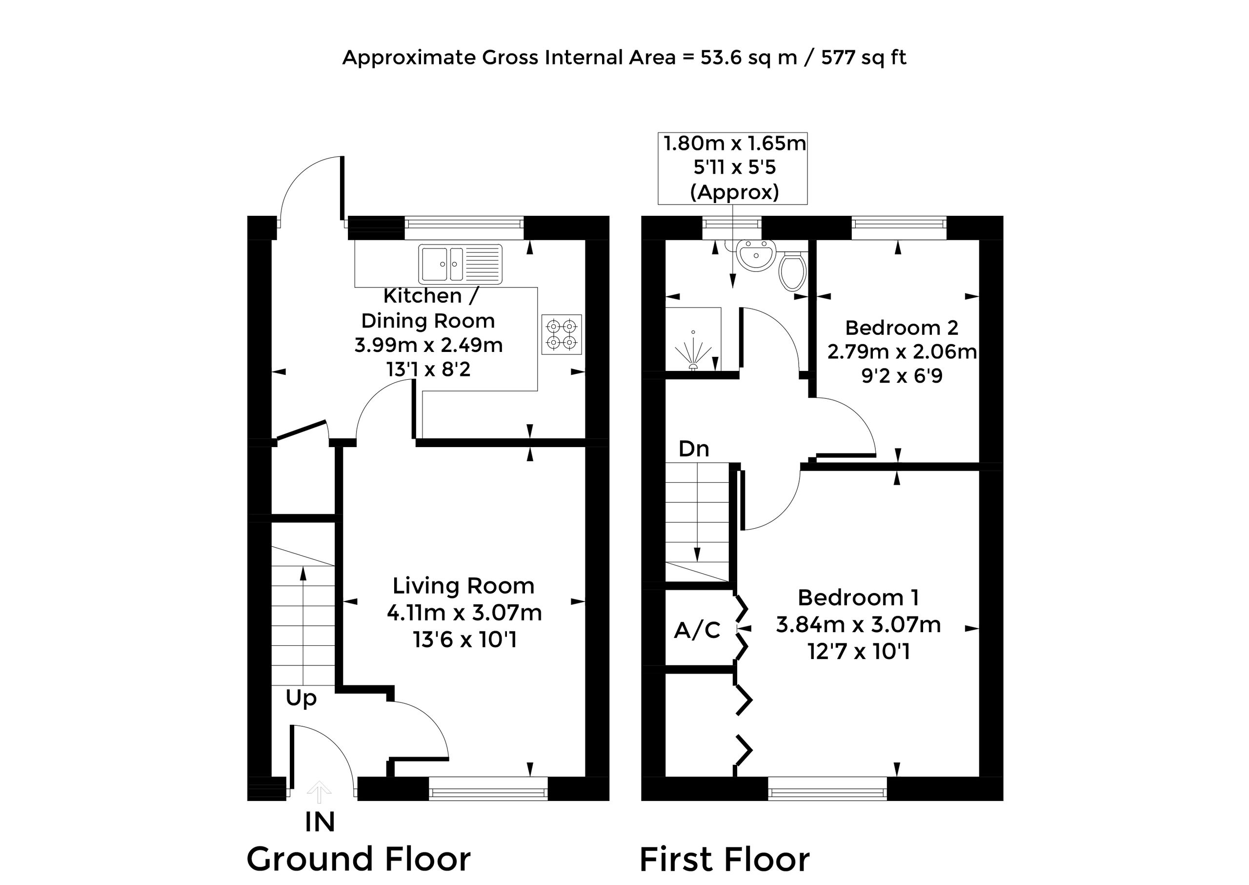 Upstairs, the home offers two bedrooms, including a generous master bedroom complete with built-in wardrobes for convenient storage. The second bedroom is well-sized and would make an ideal guest room, child’s bedroom, or home office, offering flexibility to suit a range of needs. A family bathroom serves the first floor and is fitted with a shower, along with a wash hand basin and WC, providing a functional and well-laid-out space.