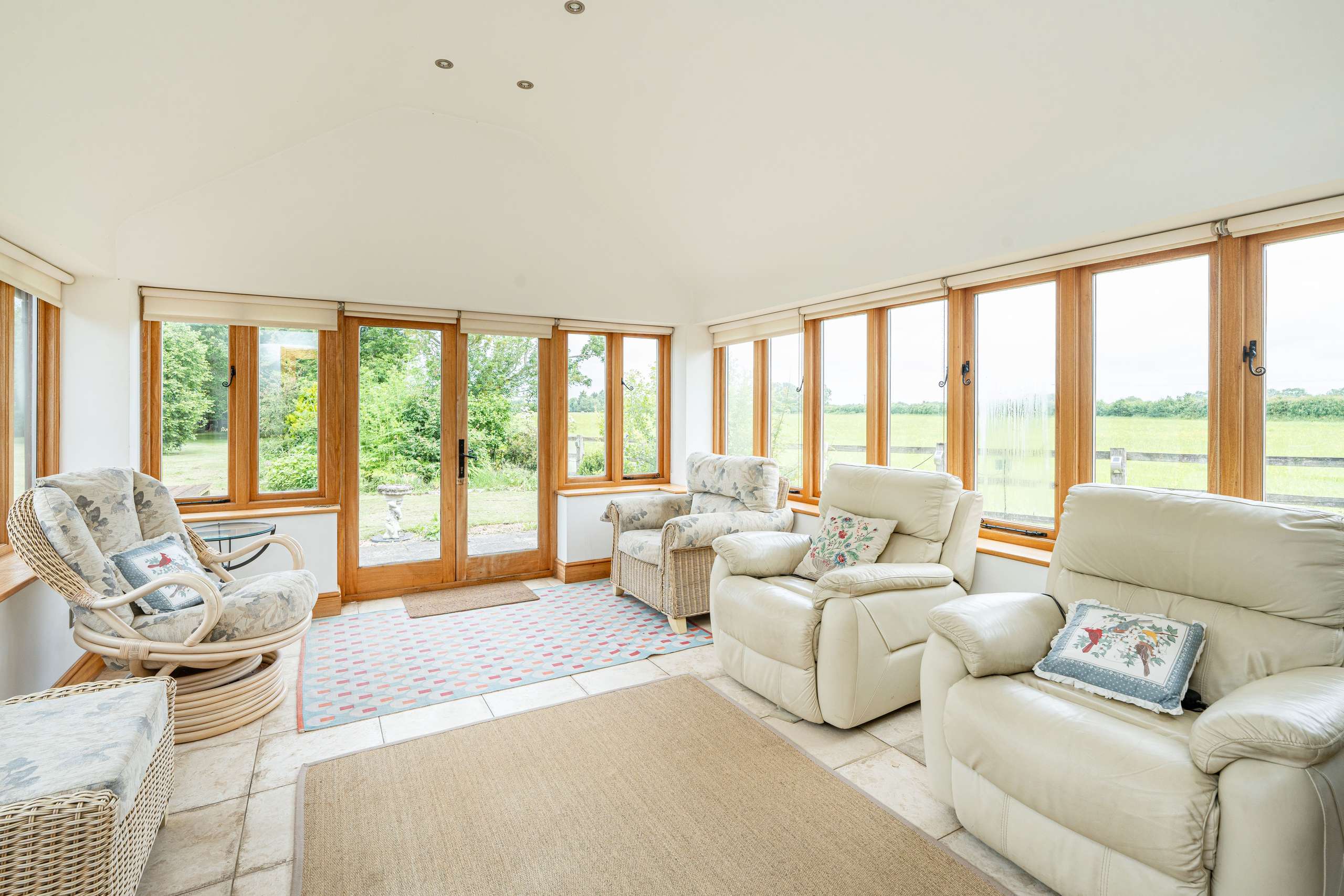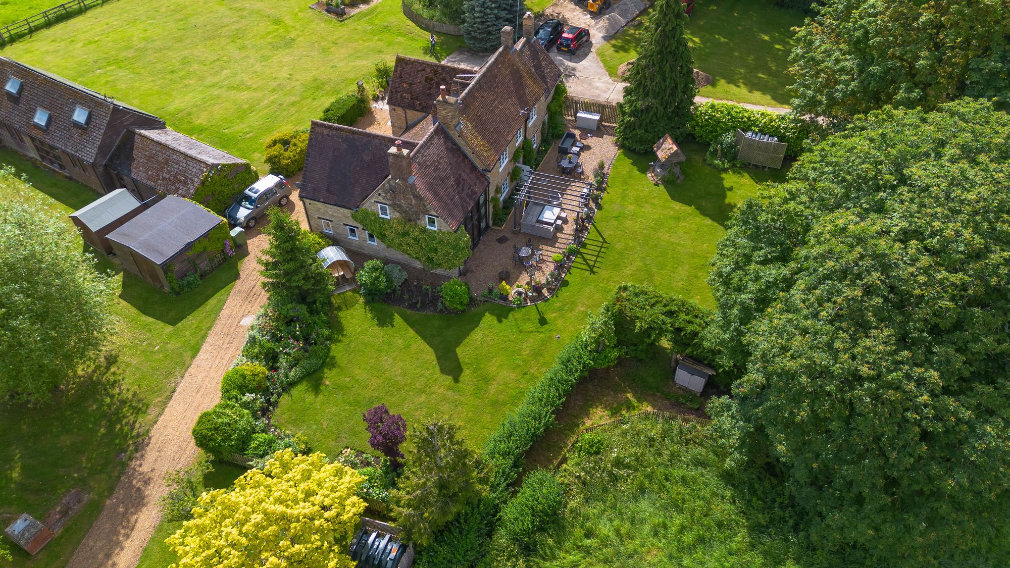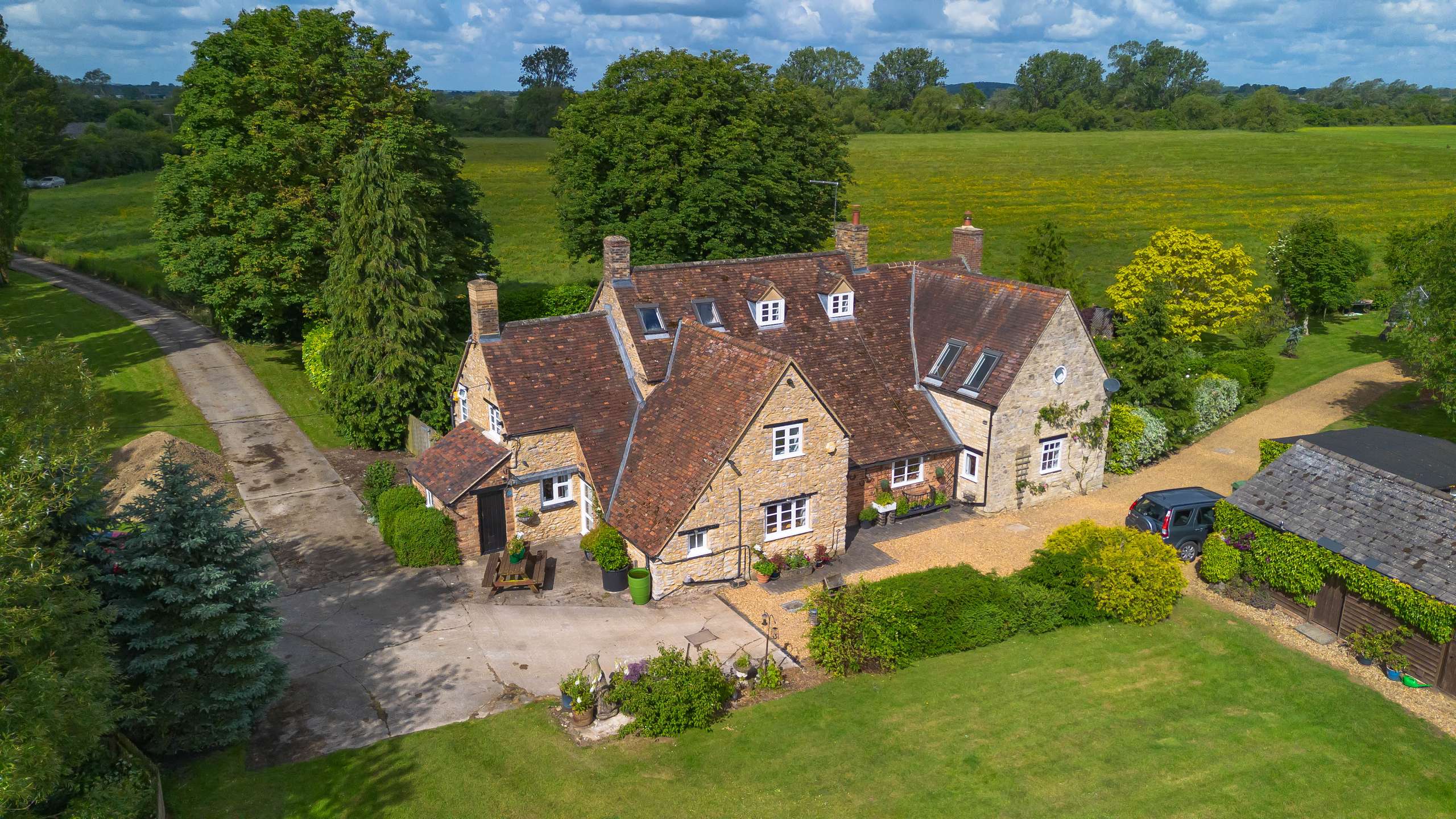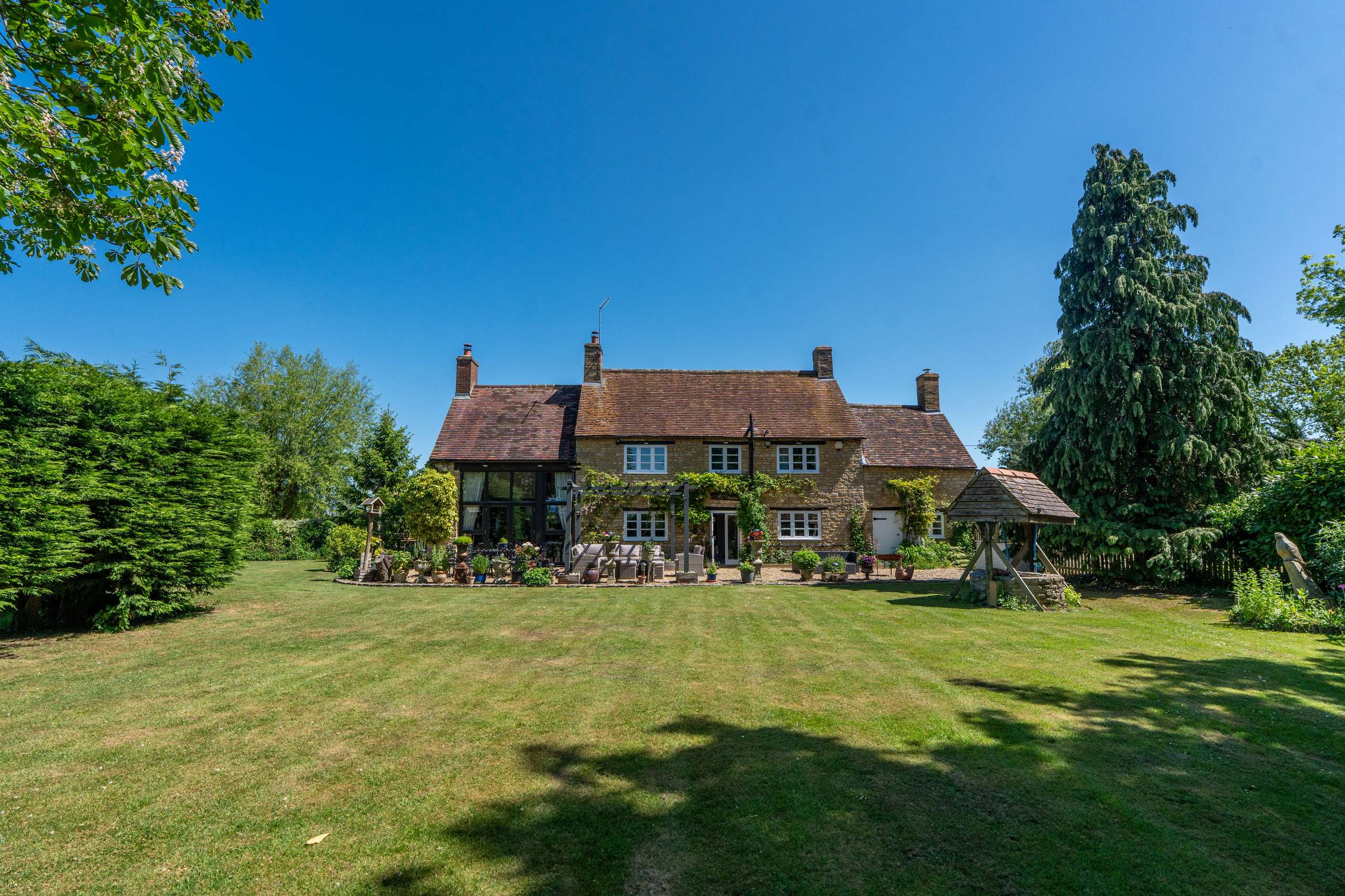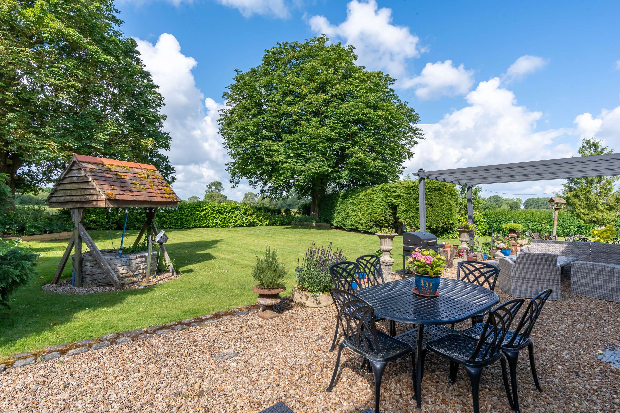 The Old Farmhouse is situated amidst idyllic gardens with lush lawns, a wonderful array of mature trees including a graceful weeping willow and a large pond. The terrace area is the perfect space for unwinding whilst enjoying the uninterrupted views within the incredibly private and peaceful setting.