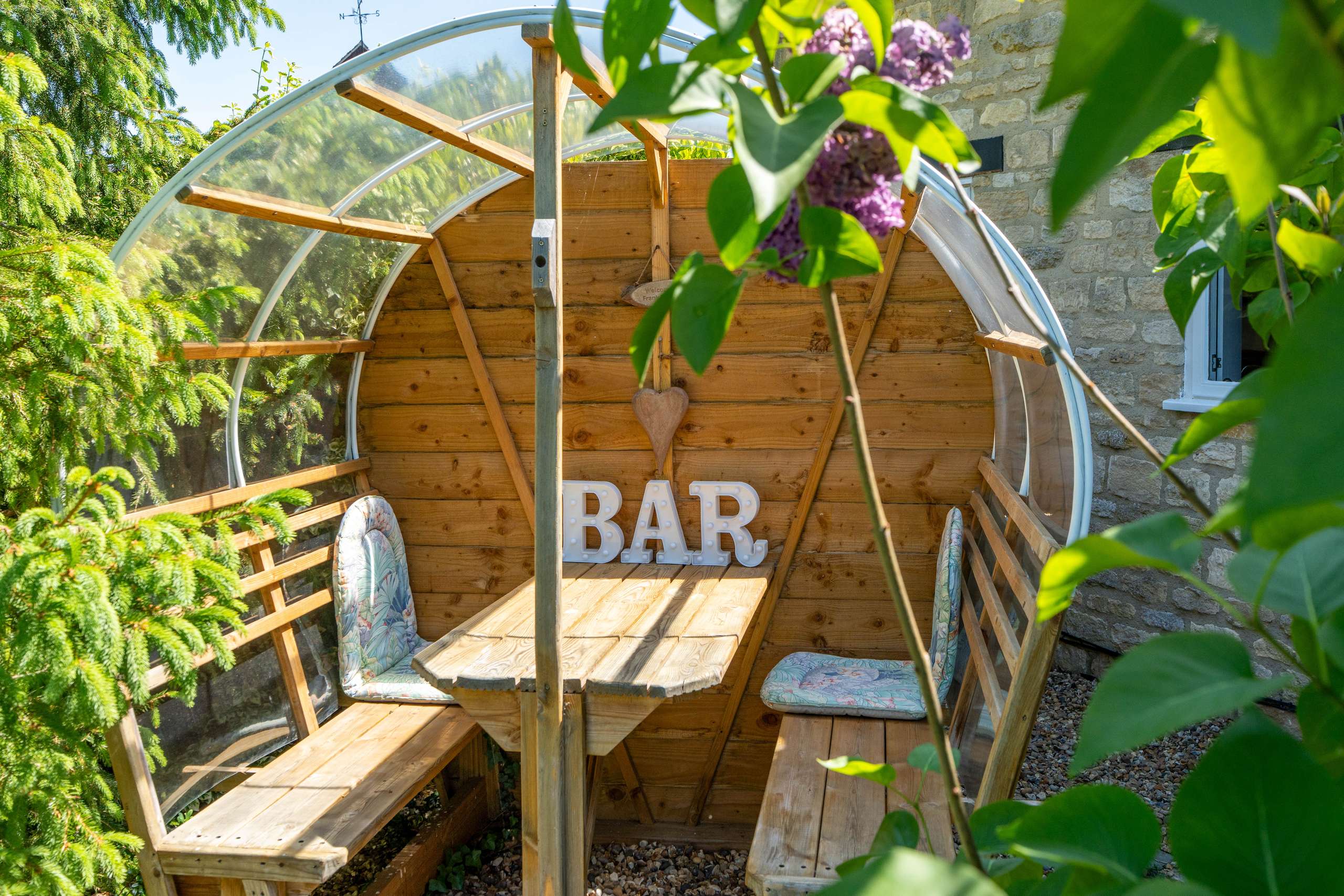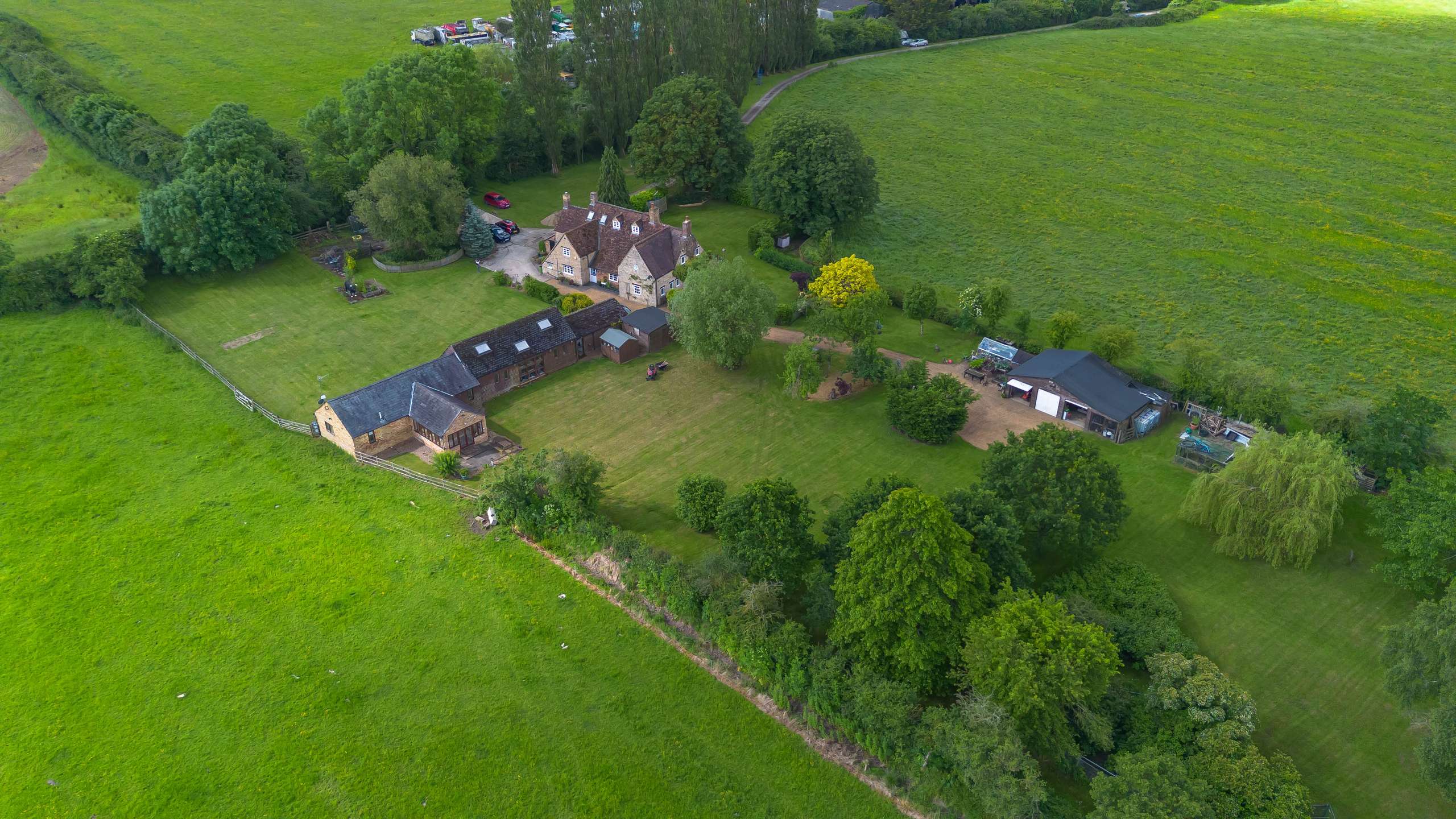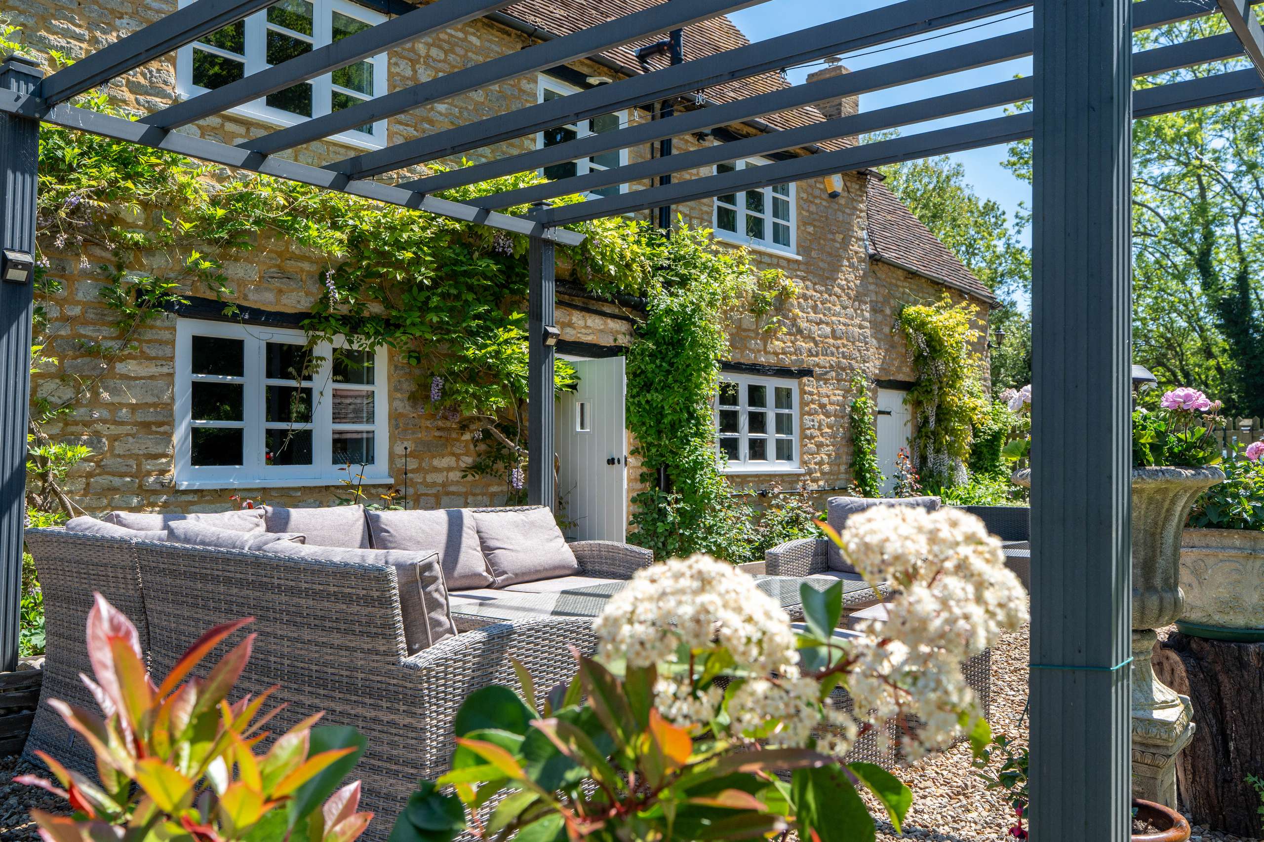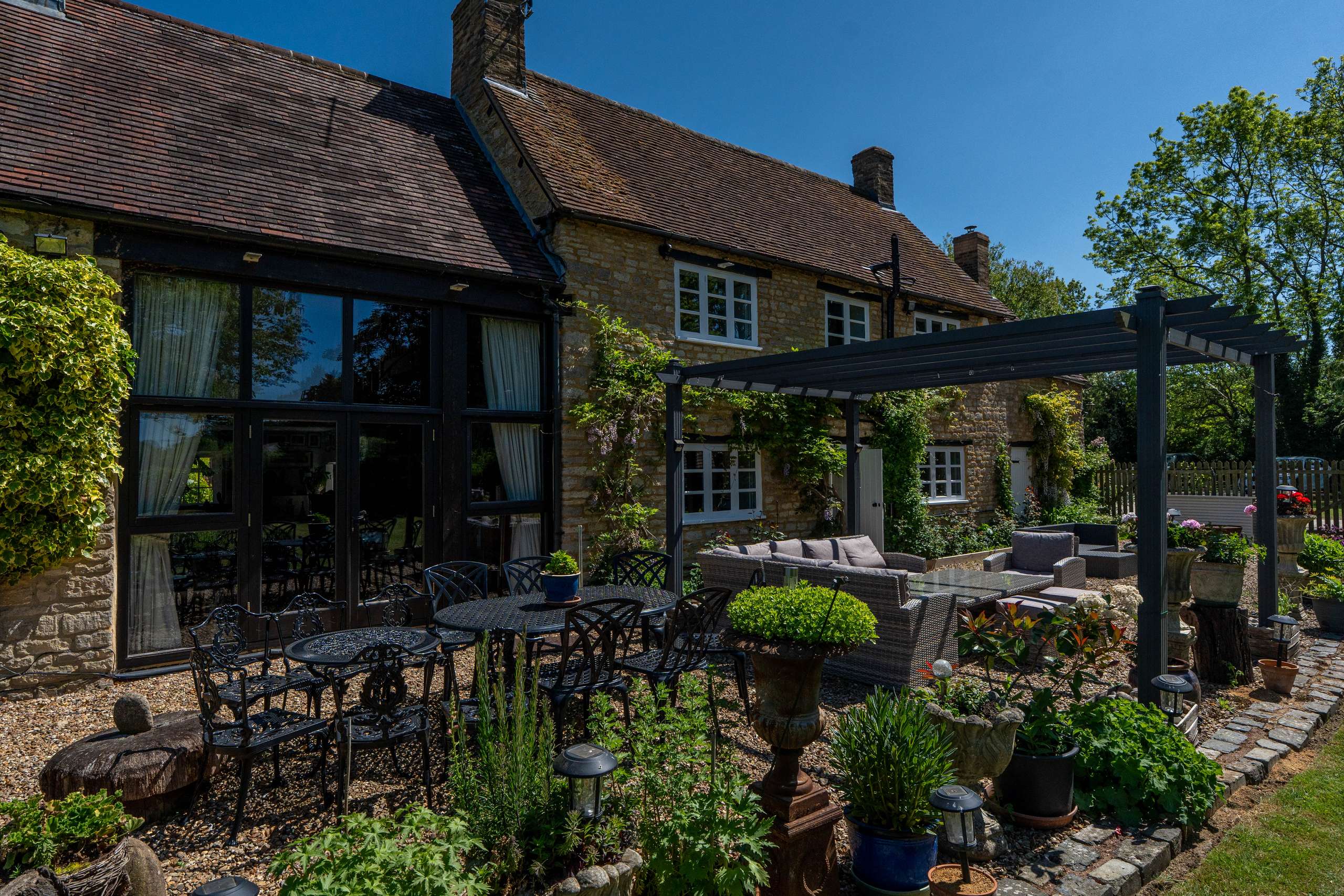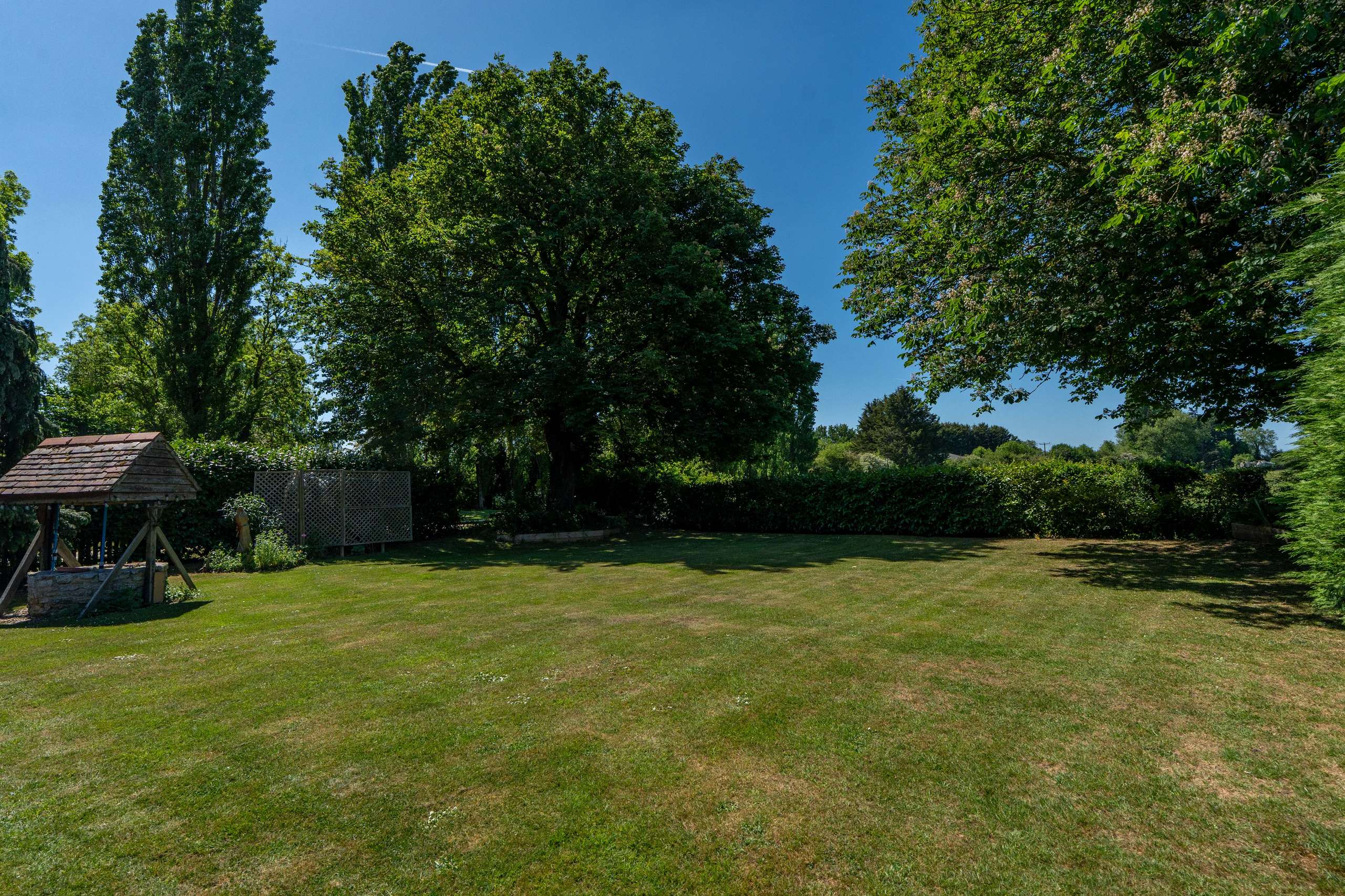 The Old Farmhouse is situated amidst idyllic gardens with lush lawns, a wonderful array of mature trees including a graceful weeping willow and a large pond. The terrace area is the perfect space for unwinding whilst enjoying the uninterrupted views within the incredibly private and peaceful setting.