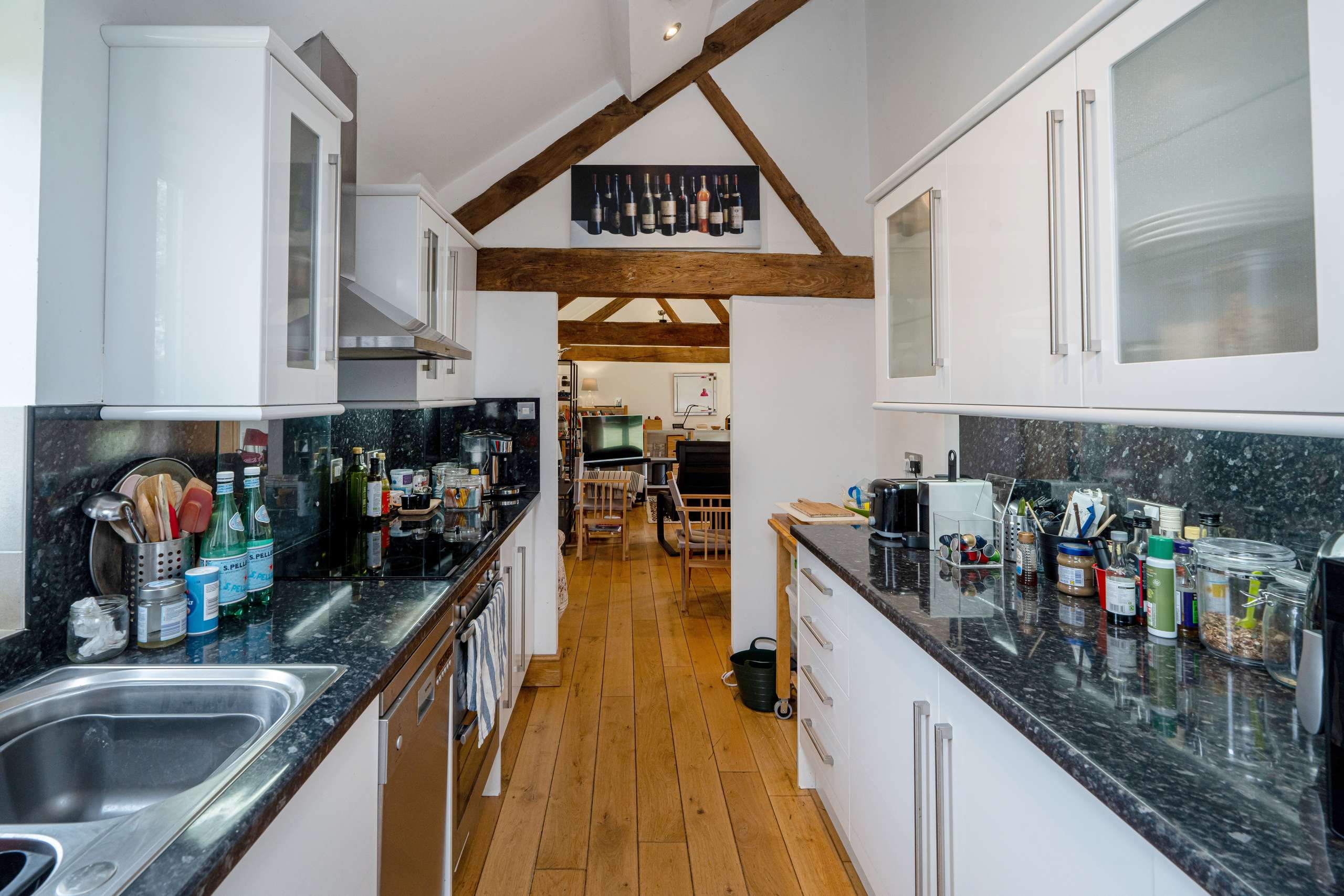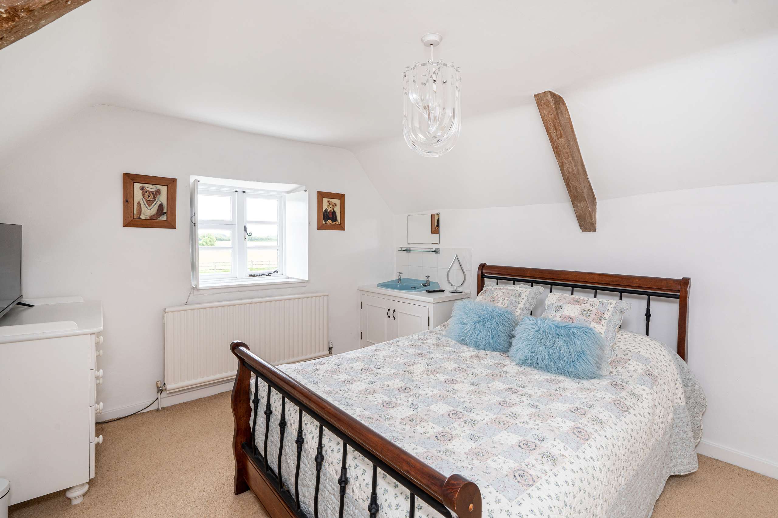 Notably, there is a separate two-bedroom single-storey annexe with a large open-plan living/dining room with impressive, vaulted ceiling with wooden beams and exposed brickwork wall. Wooden flooring runs seamlessly throughout the space into the modern galley-style kitchen and both bedrooms. Both bedrooms have their own bathrooms. A standout feature is the delightful sunroom the to the rear. It is currently rented out for £1600pcm and the tenancy ends in June 2025.