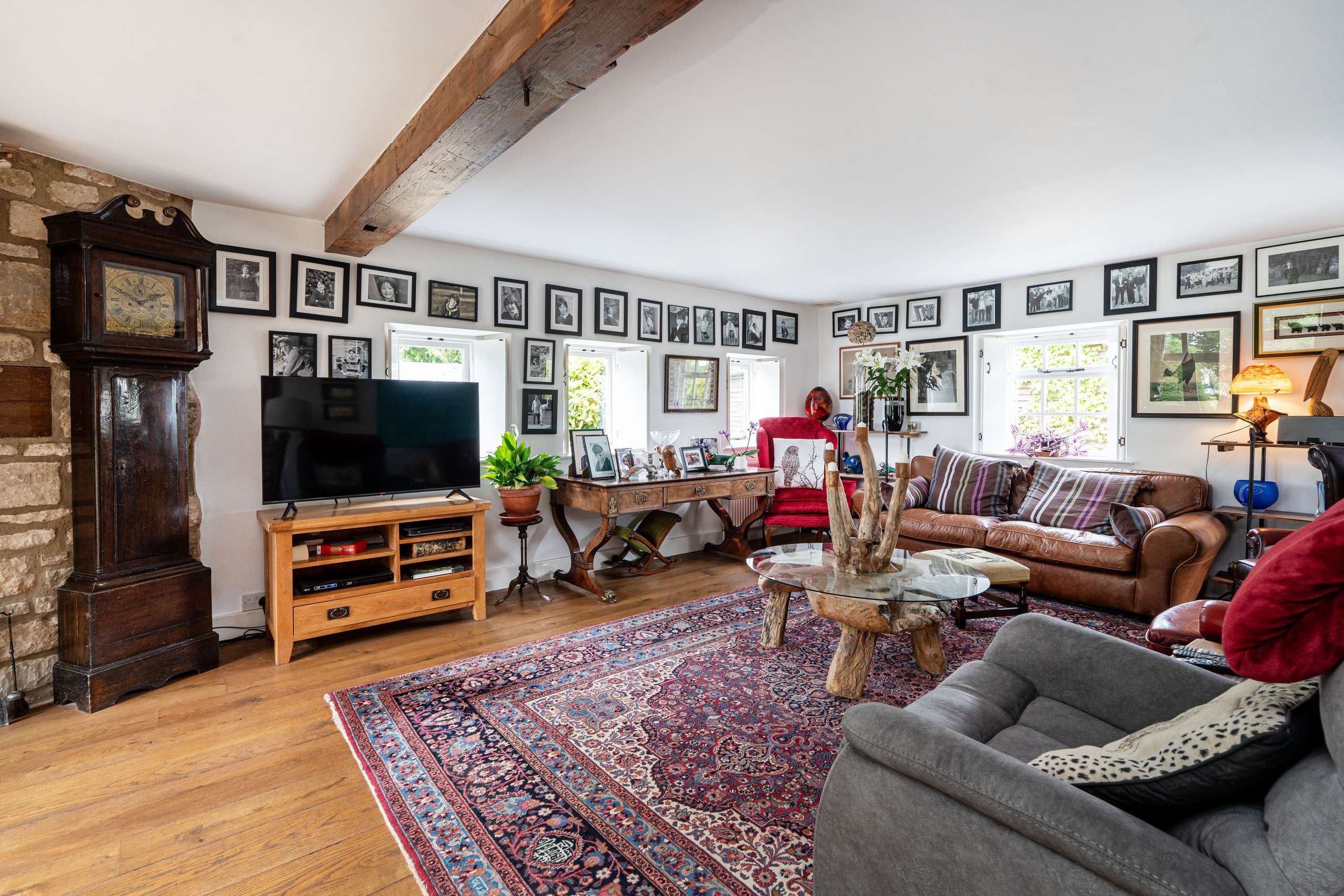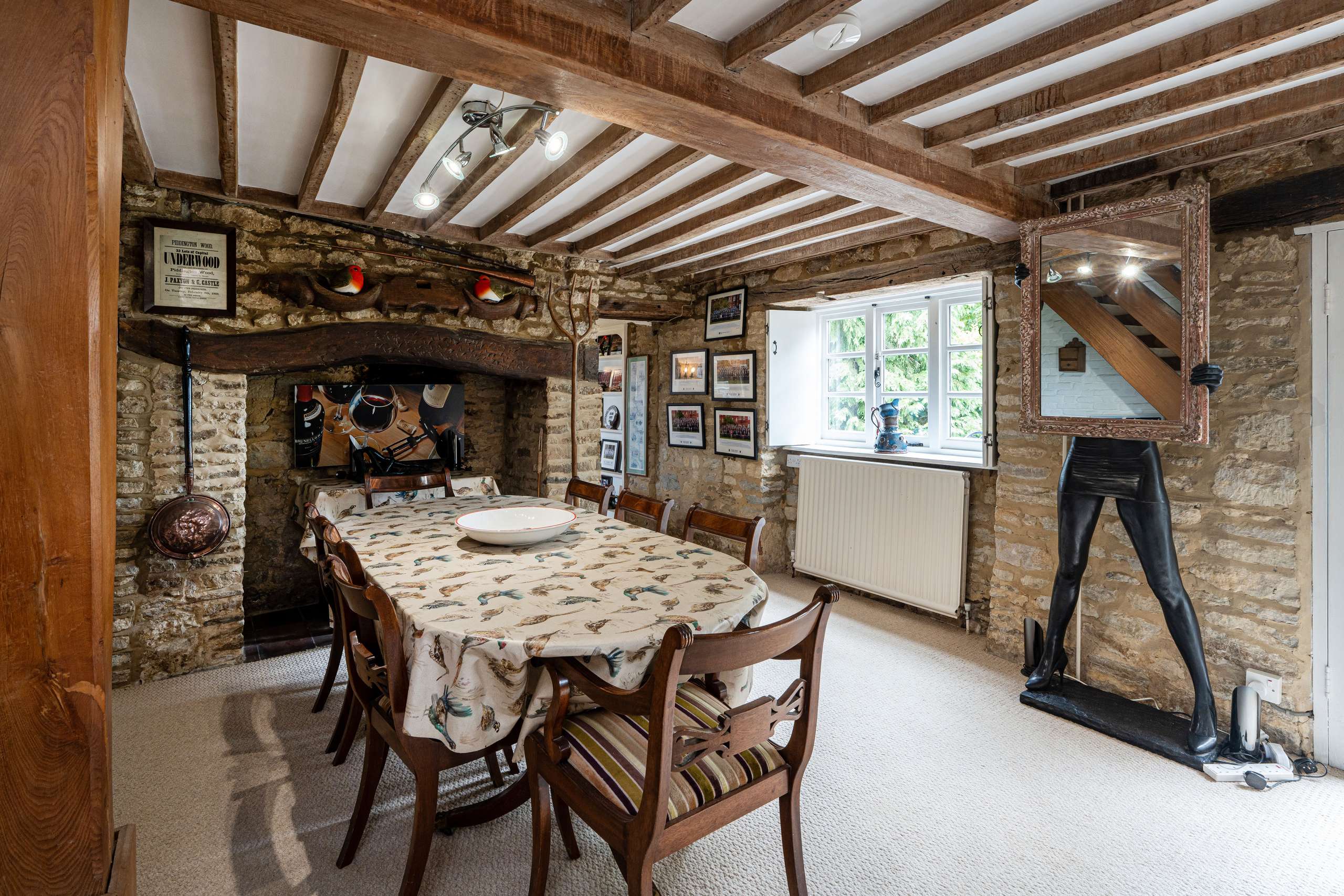The ground floor offers several reception rooms including the magnificent main sitting room, flooded with natural light with a part-double height ceiling and windows through 360-degree aspect, including a fully glazed wall with door leading to the garden merging effortlessly the indoor and outdoor spaces. Exposed stonework walls, fireplace with cozy log burner and elegant black spiral staircase help to create a perfect blend of contemporary elegance and rustic charm.