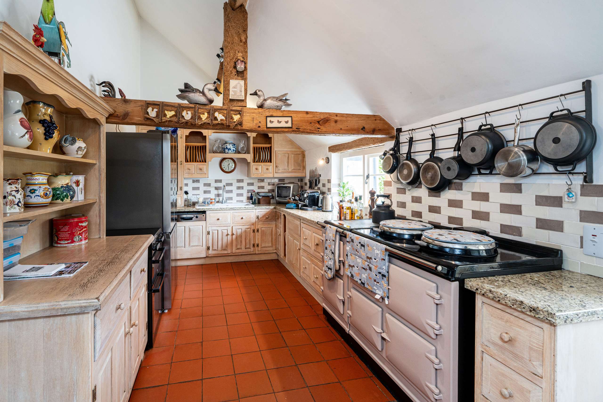 Adjacent to the sitting room is an office enveloped by beautifully exposed stonewalls and with a working fireplace. The traditional farmhouse kitchen with high ceilings and striking cross beam is complete with an Aga. Terracotta flooring continues from here into a dining room with wonderful beams. The character features continue into the delightful larger dining room, also accessed from the kitchen, featuring an Inglenook fireplace, with plenty of light from the window and a glass double door leading to the garden. Completing the ground floor is an additional dual aspect sitting room/den and WC.