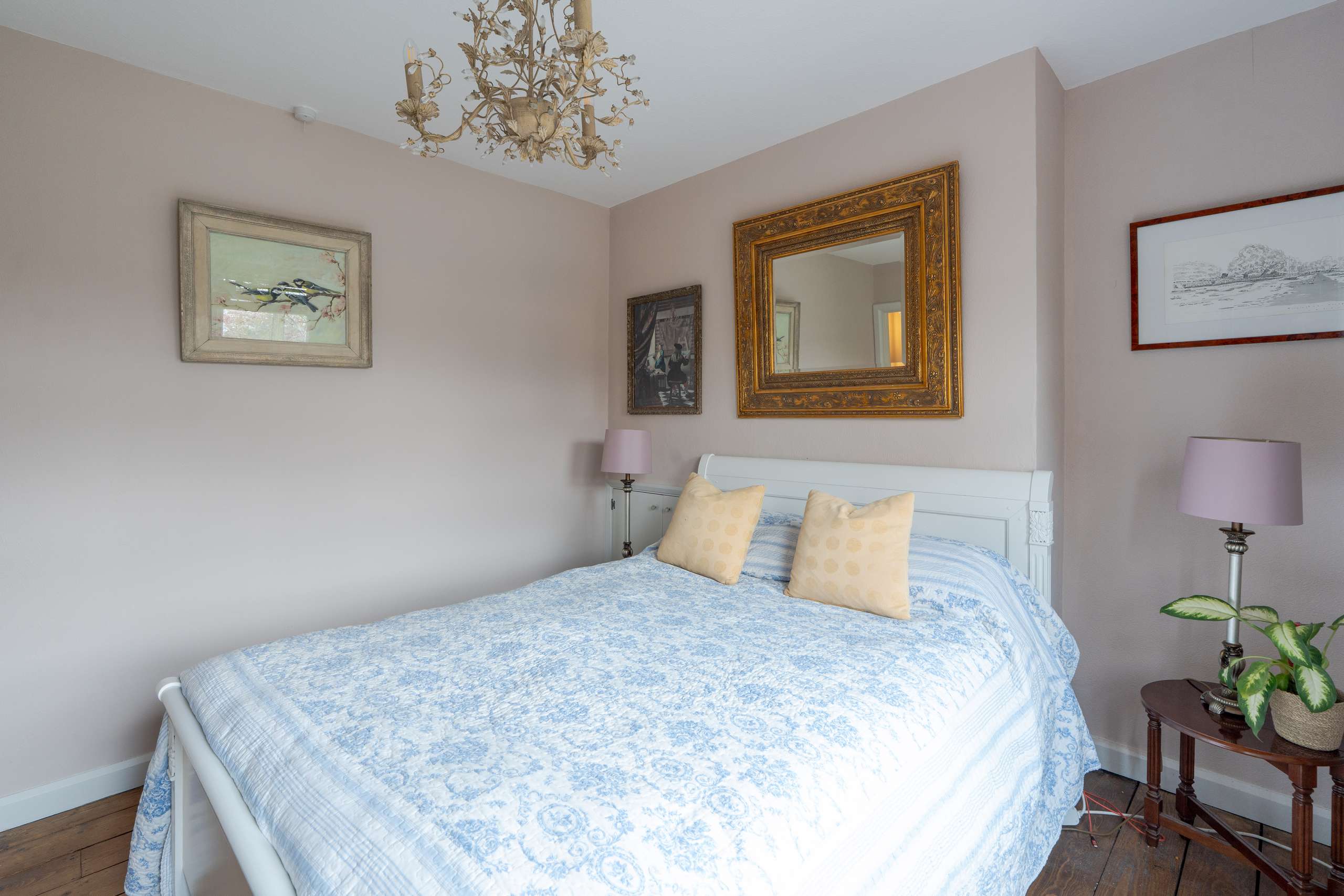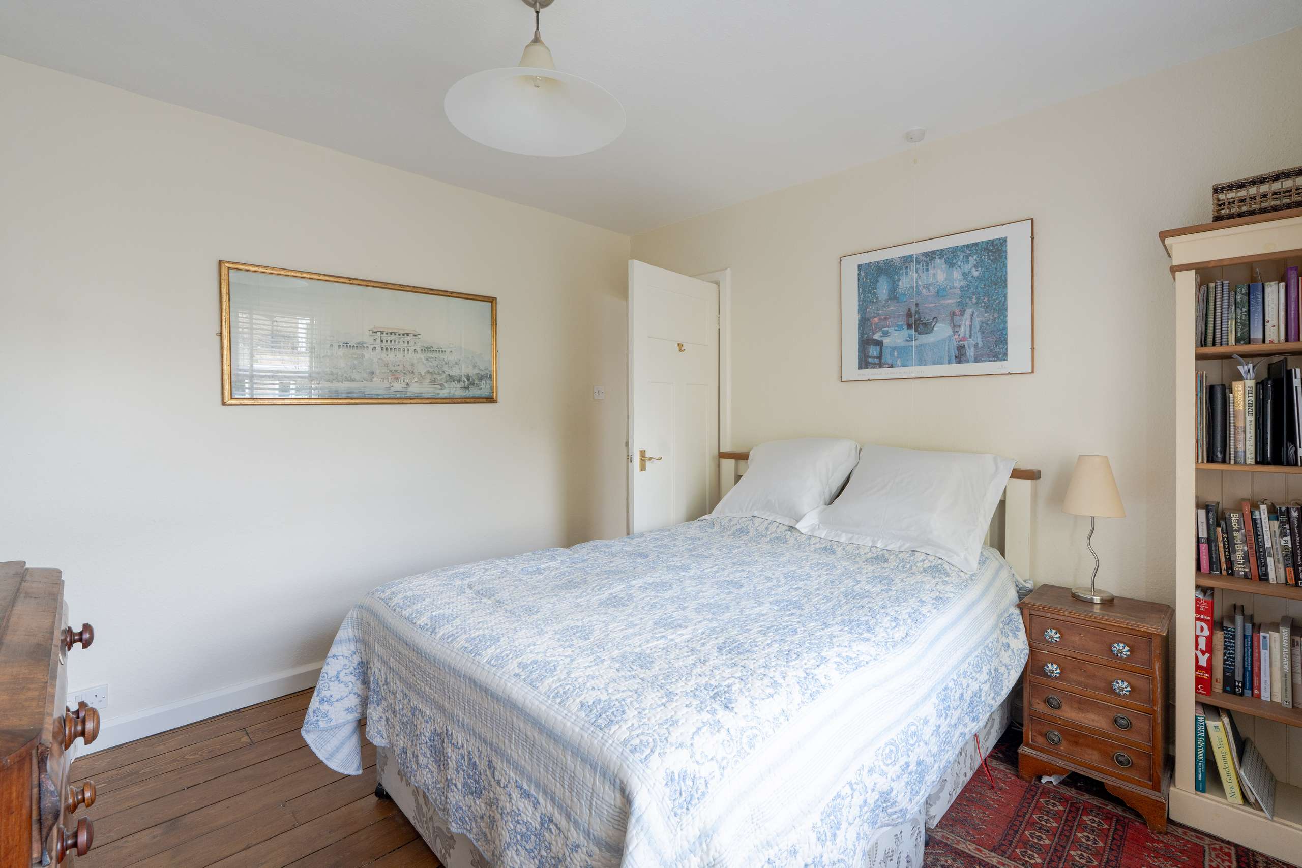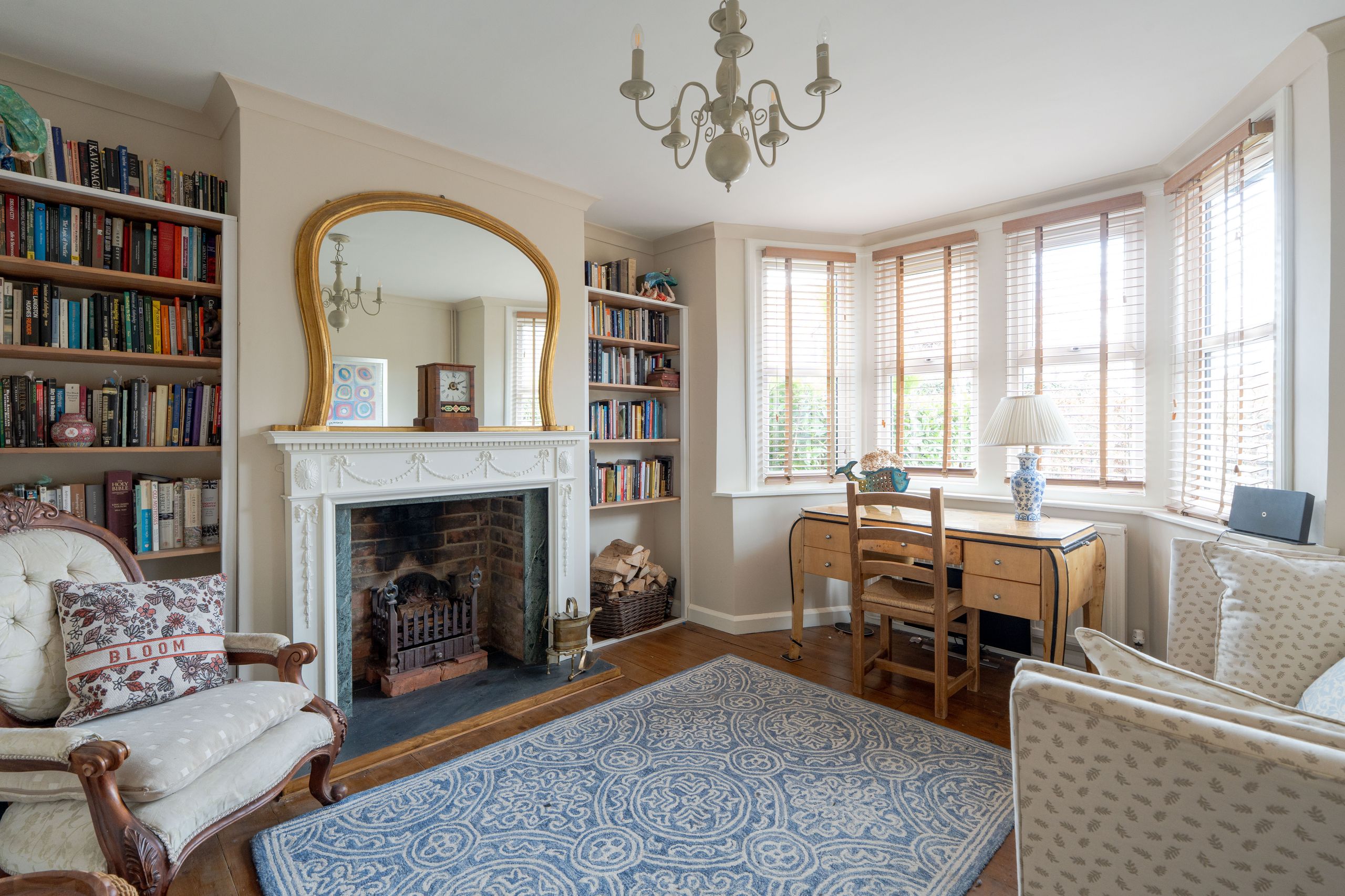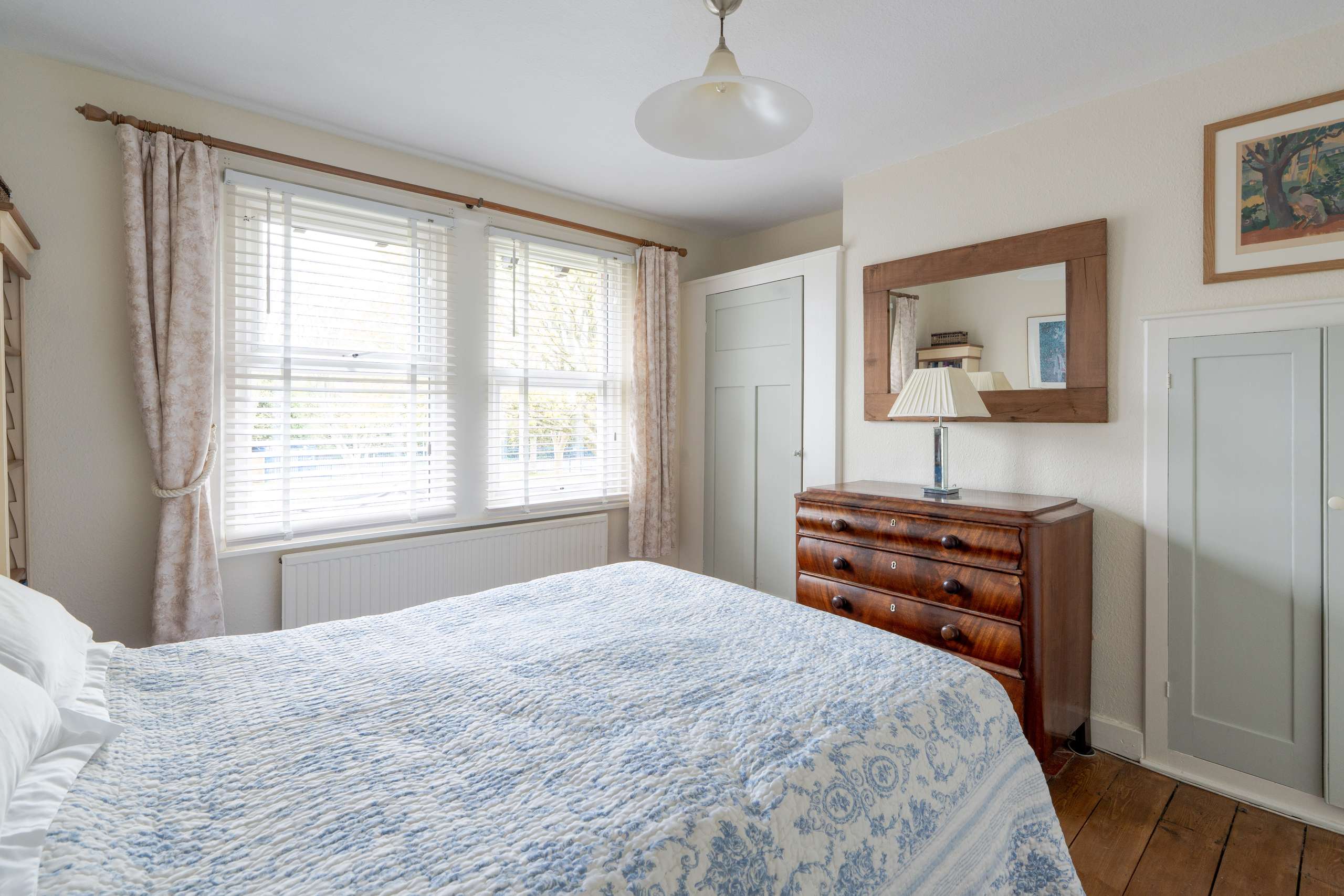 A light-filled central staircase leads to the first-floor landing, where the home’s charm continues into a family bathroom and two generously sized double bedrooms. Each room enjoys plenty of natural light, with built-in storage thoughtfully incorporated throughout.