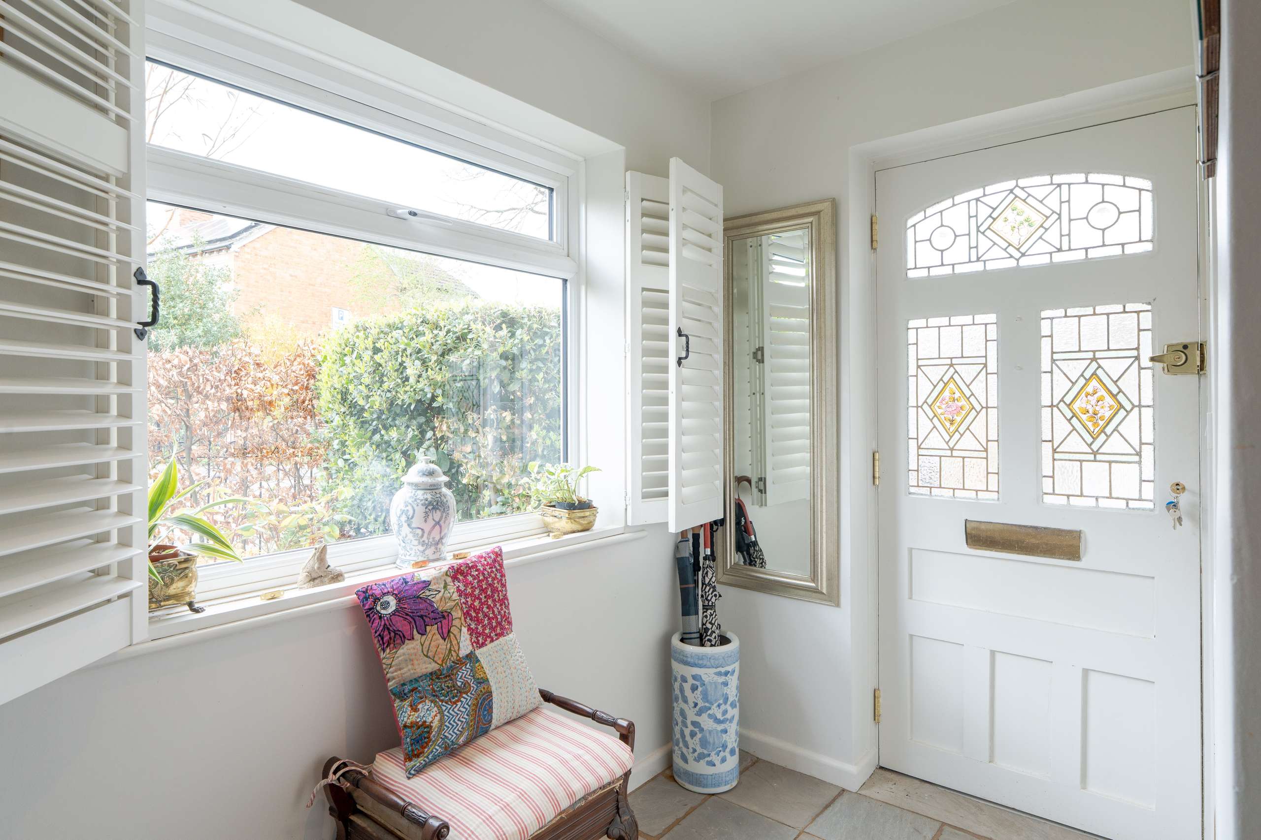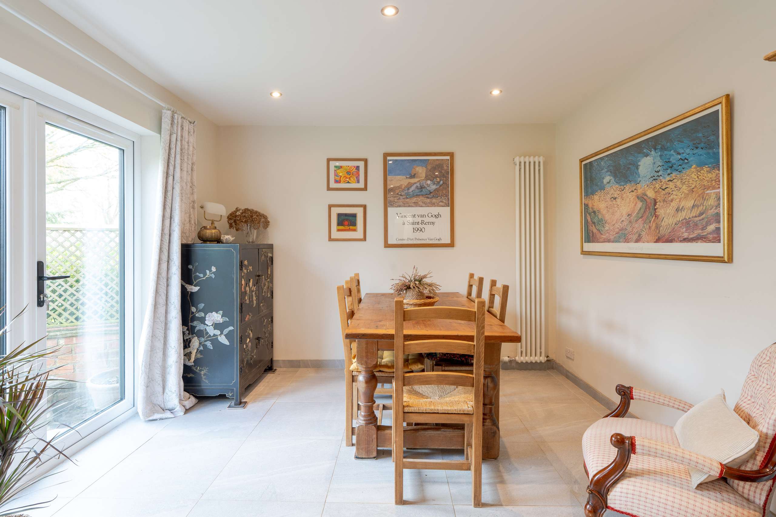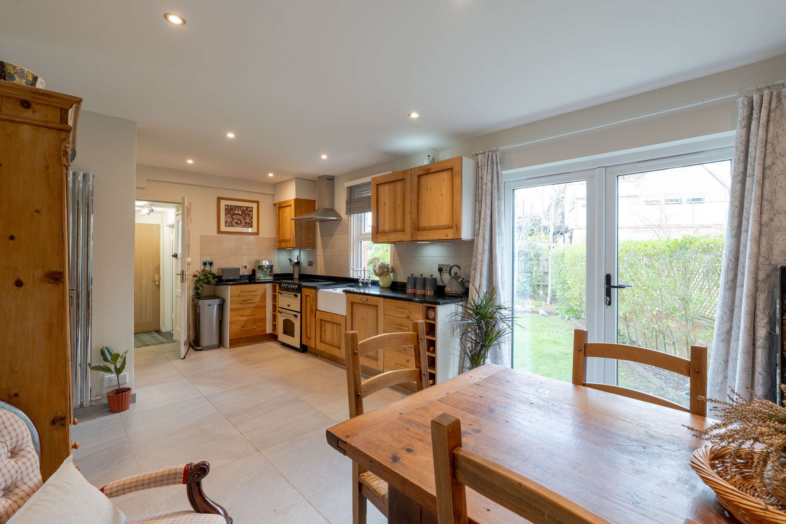 Set back from the road, the property is approached via a well-maintained front garden and is screened by a tall hedge, offering a strong sense of privacy. A spacious entrance porch opens into a central hallway, which flows seamlessly into the two principal living areas. At the front of the house, a charming reception room overlooks the garden and is filled with natural light from a large bay window. Notable features include an open fireplace with an attractive surround, exposed timber flooring, and fitted alcove bookcases. To the rear, a generous kitchen/dining room spans the full width of the house, complete with shaker-style cabinetry, plenty of space for a large dining table, and glazed French doors that beautifully frame the well-stocked, tranquil rear garden. Adjoining the kitchen is a convenient utility space and cloakroom, with direct access through to the garage. This space further benefits from a useful internal passageway, offering access from the front of the house through to the rear garden.