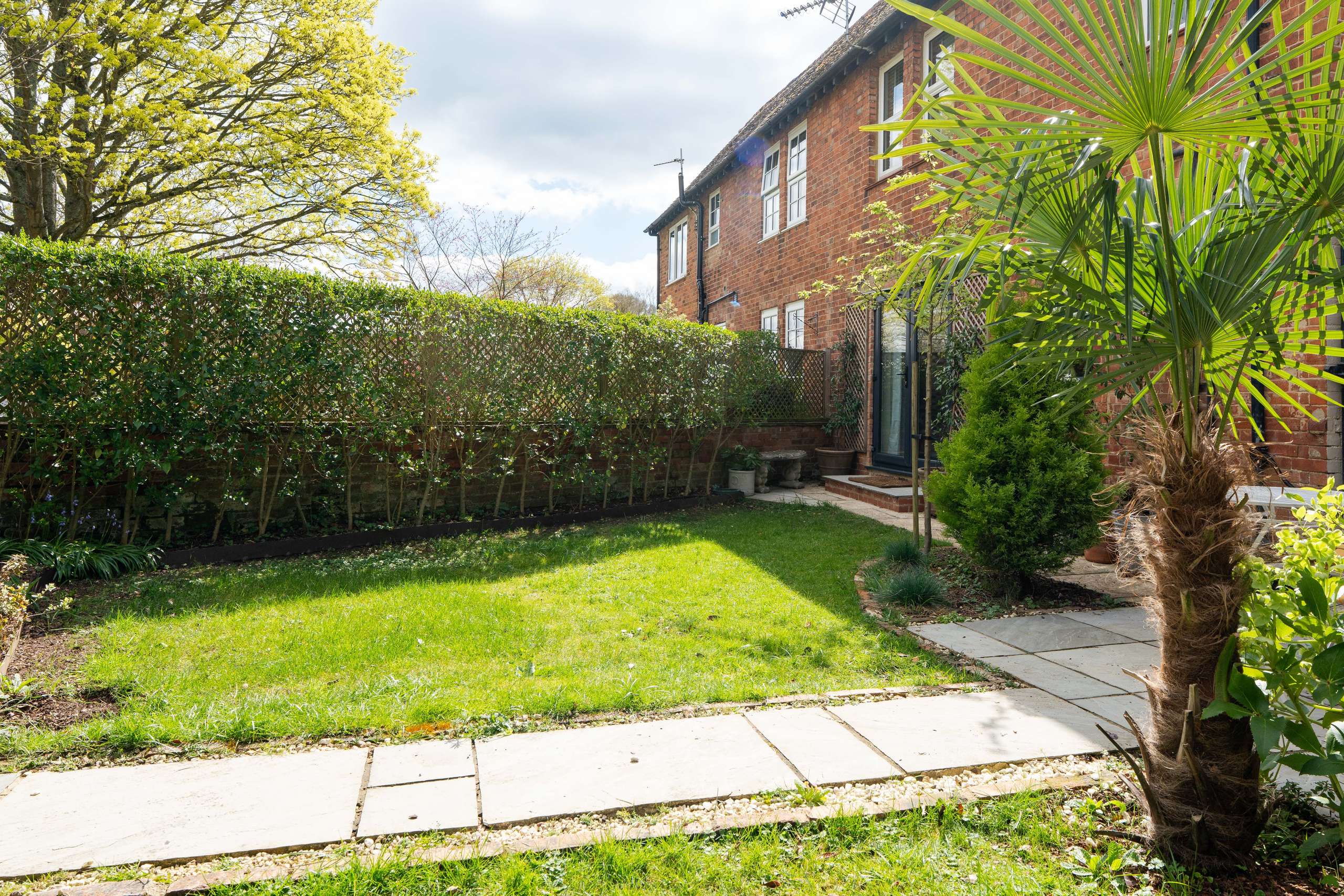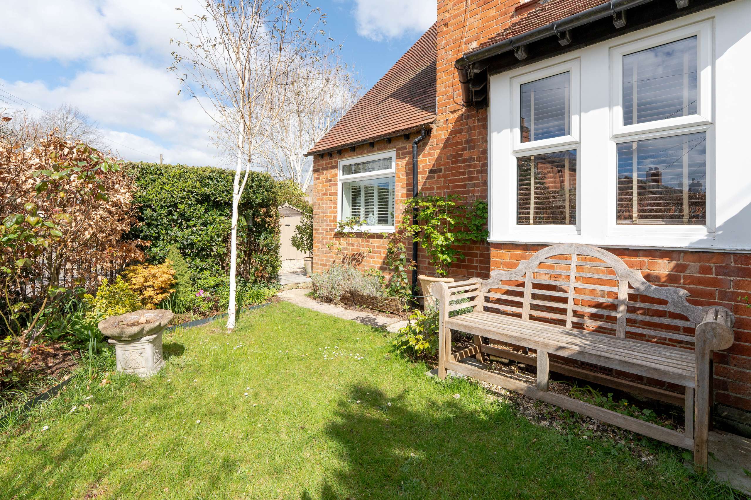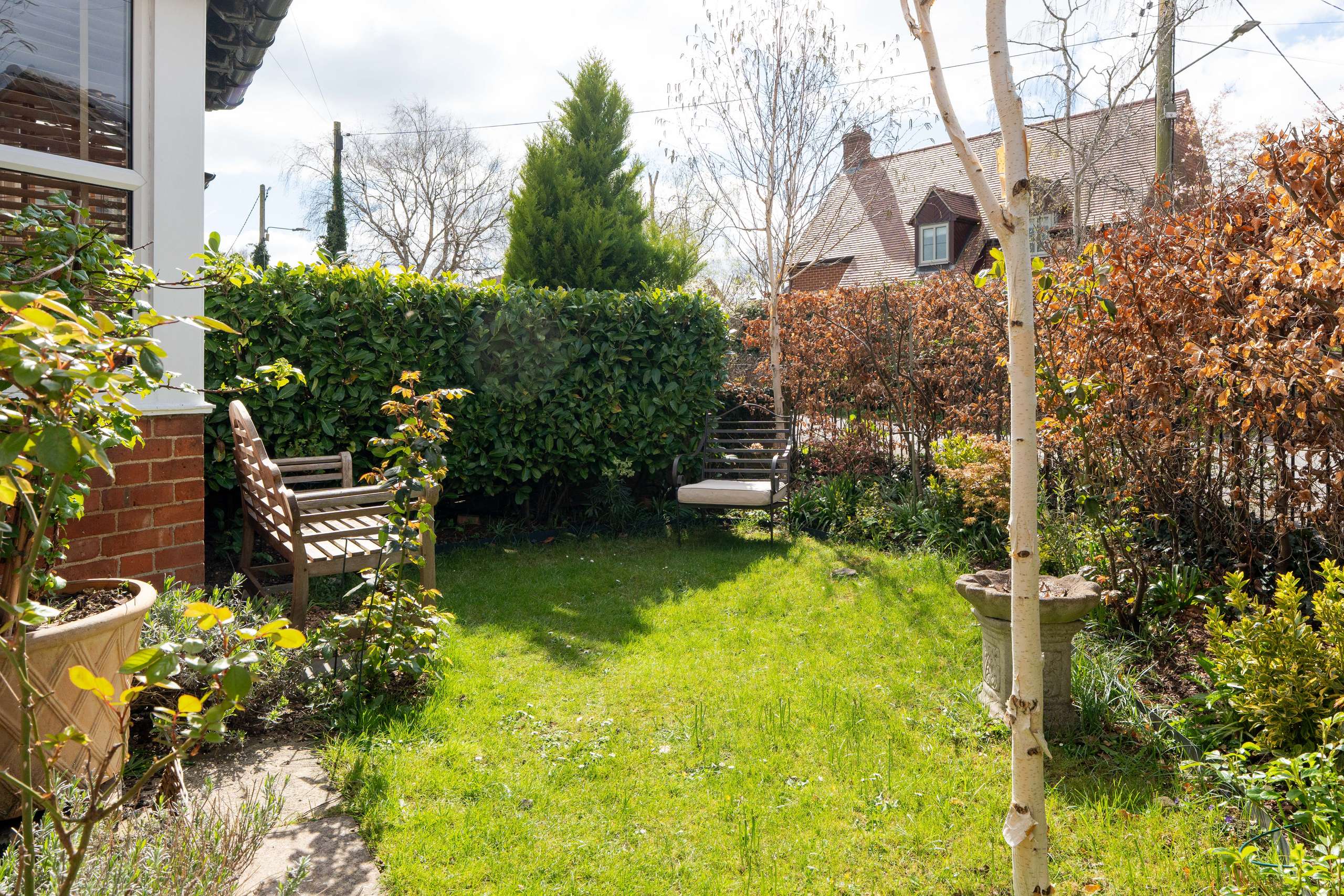 Externally, the property features a beautifully landscaped rear garden with a lawn, established planting, borders, and a patio area ideal for outdoor dining and entertaining. To the front, a charming garden is screened by a tall hedge, providing a good degree of privacy. To the side, a gated driveway leads to a single garage.