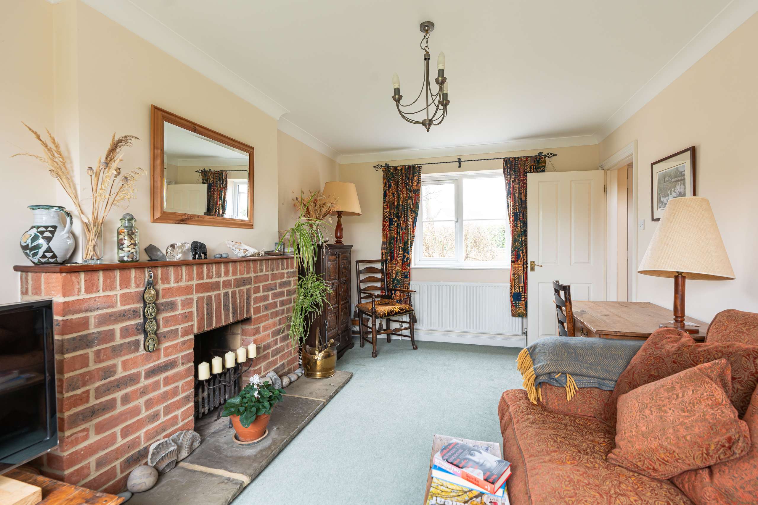 - Living room with brick-built fireplace and patio doors to the rear garden