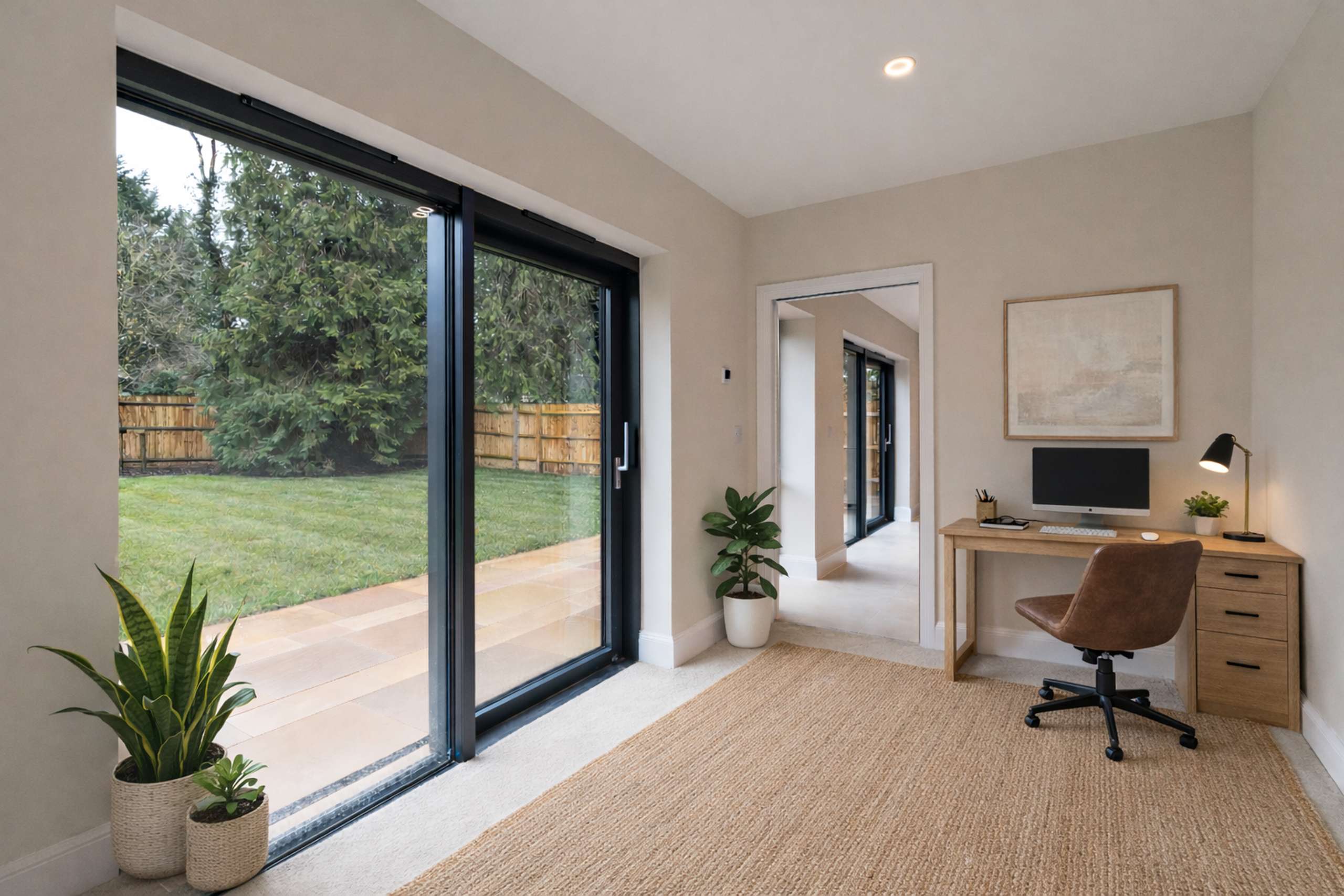 - Generously sized kitchen with integrated appliances, central island and sliding doors to the garden