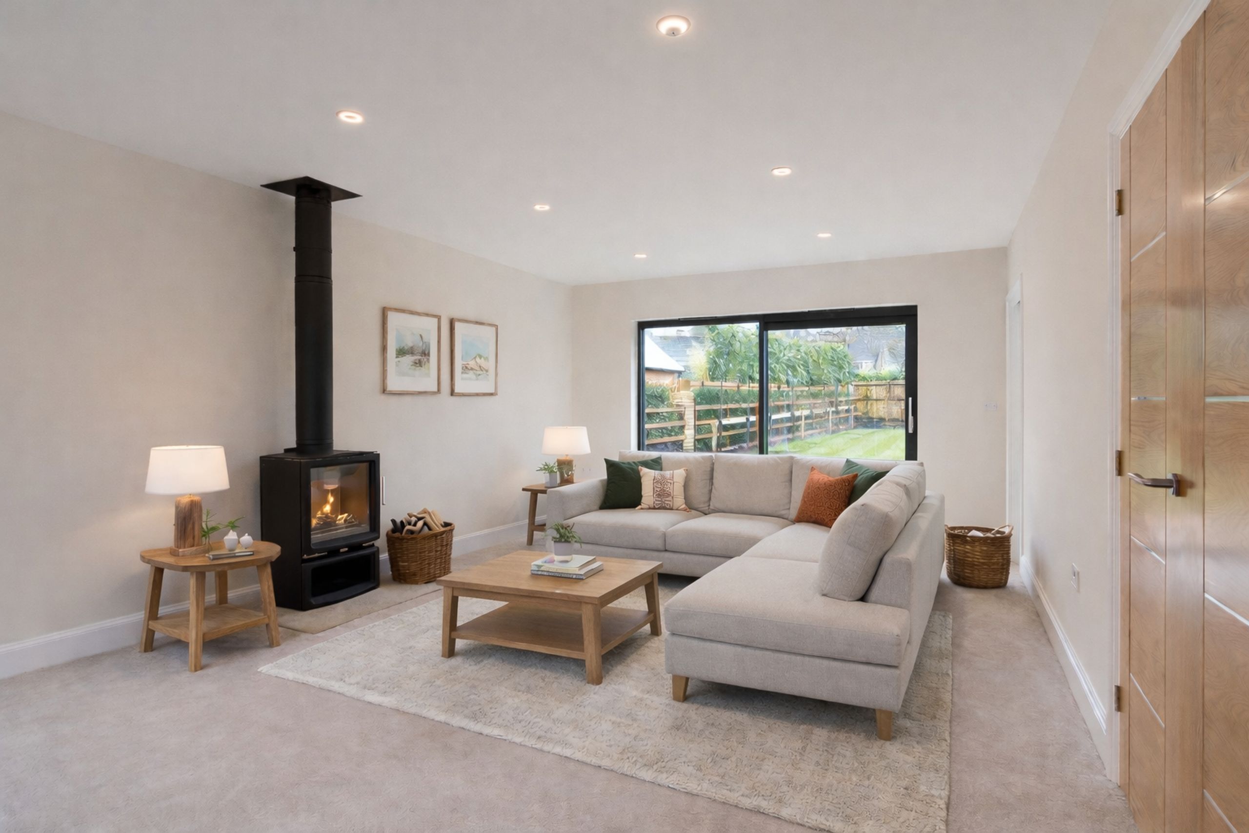- Spacious living room with wood burning stove and access out to the garden