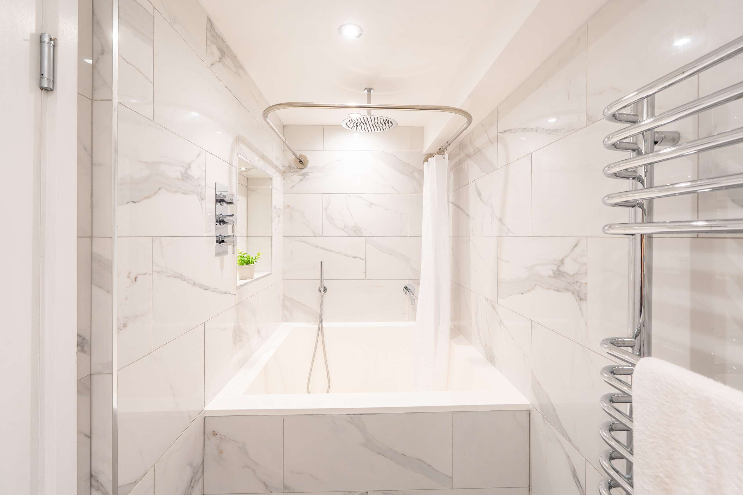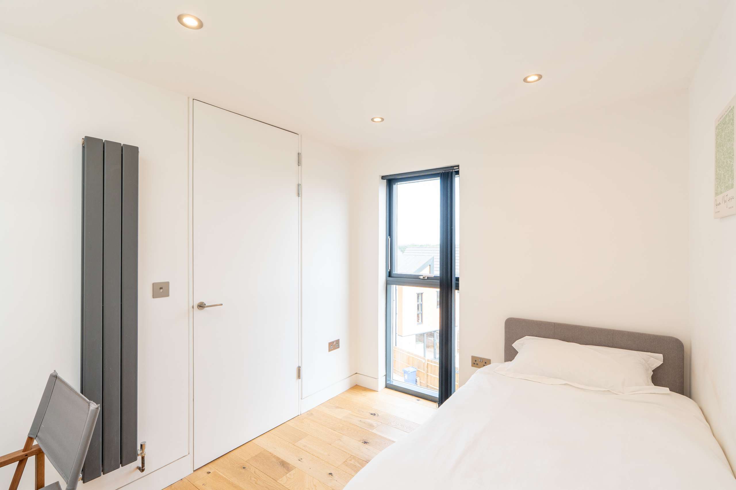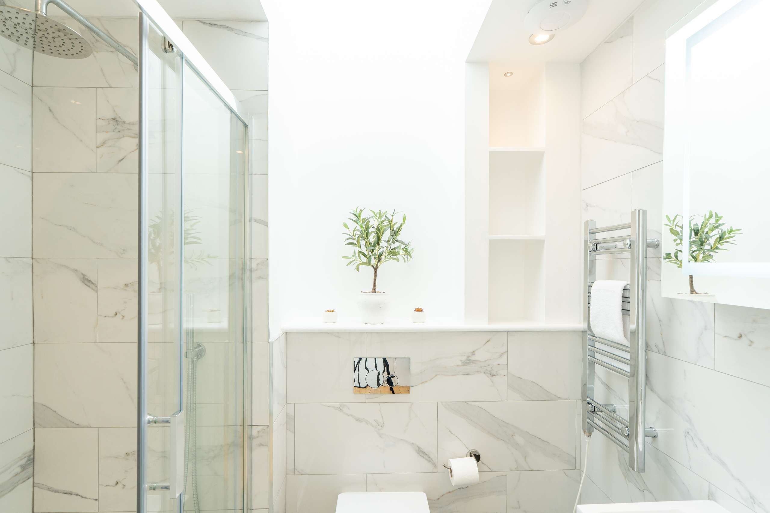 Upstairs to the second floor, the landing is lit by a skylight overhead, and vertical window bringing in additional natural light. There are two further bedrooms, both with fitted storage, and a shower room finished in the same marble tiles as the ensuite on the floor below creating visual harmony.