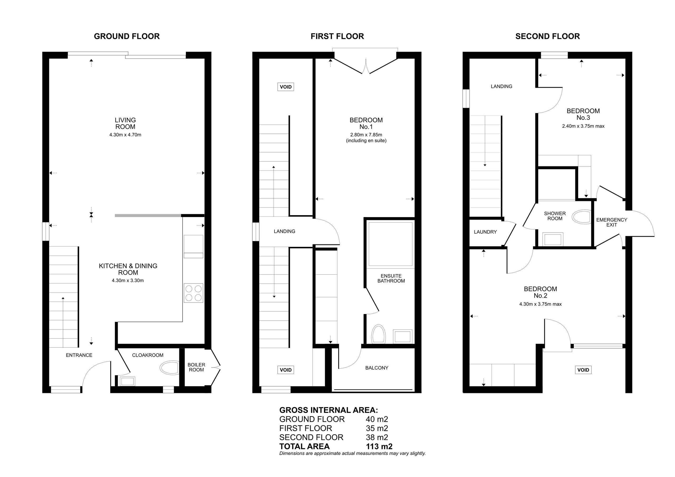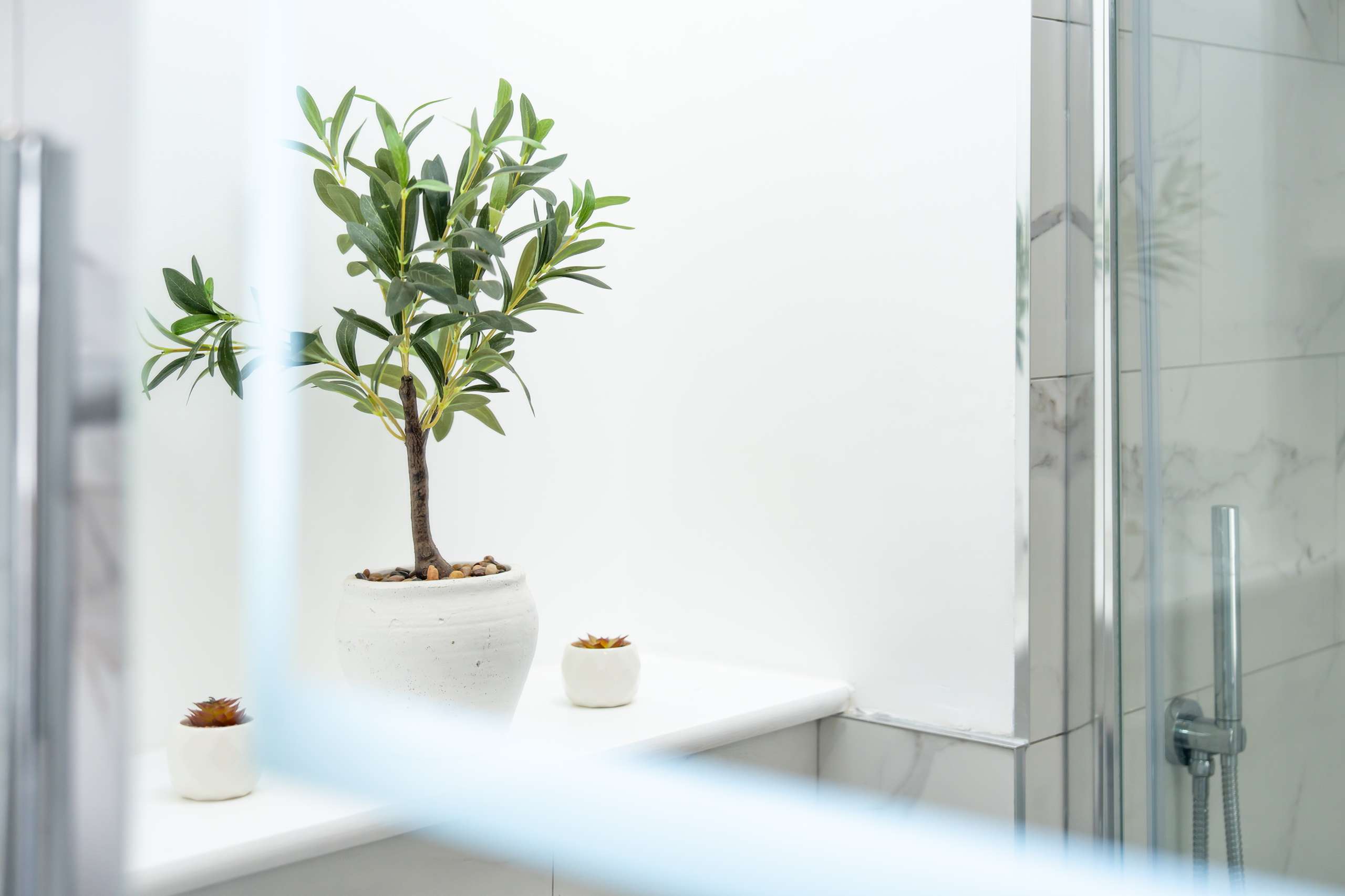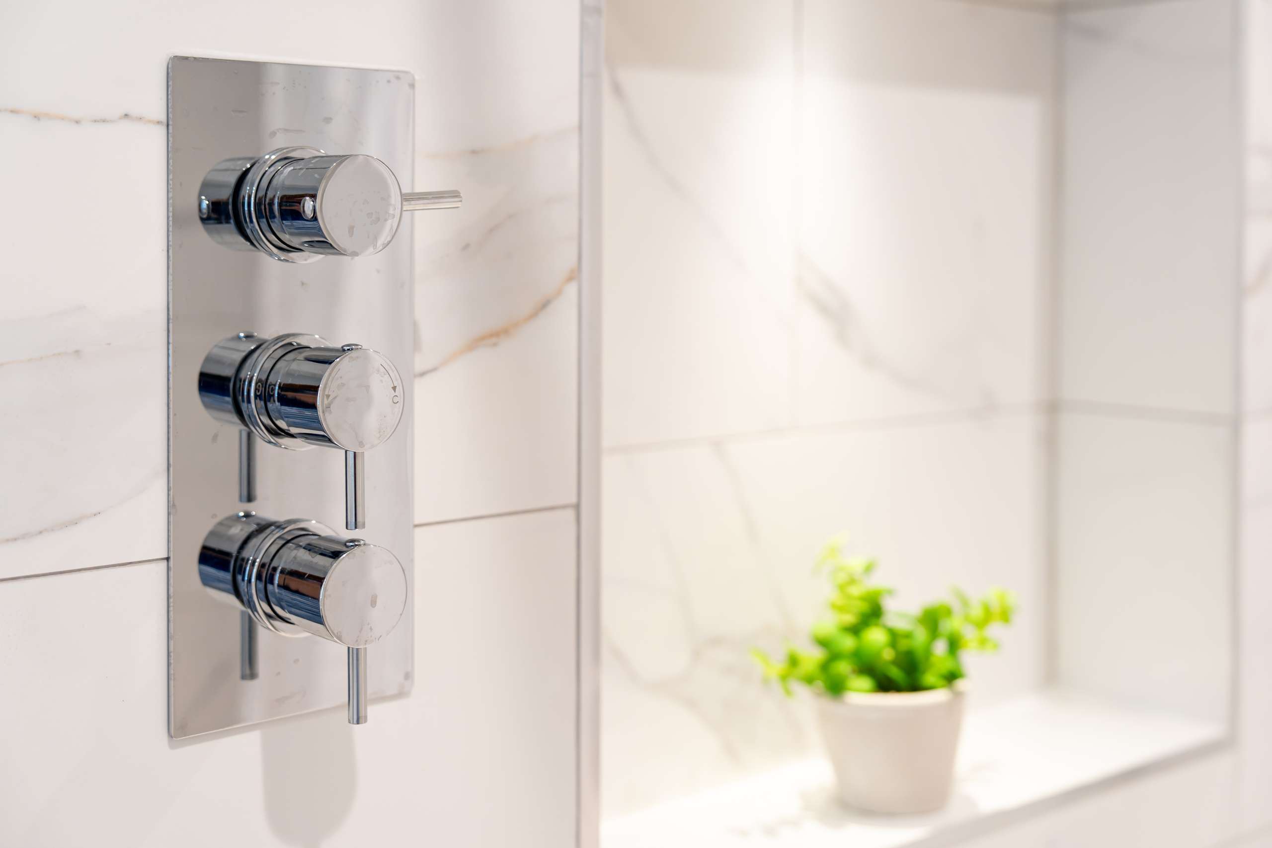 Upstairs to the second floor, the landing is lit by a skylight overhead, and vertical window bringing in additional natural light. There are two further bedrooms, both with fitted storage, and a shower room finished in the same marble tiles as the ensuite on the floor below creating visual harmony.